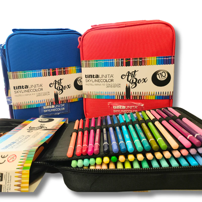 Astuccio maxi con 110 pastelli mina 4.0, con pratica maniglietta da trasporto, tasca esterna multiuso chiusa con velcro. Interno organizzato con 4 flap organizzati. 108 pastelli + 2 Multicolor.