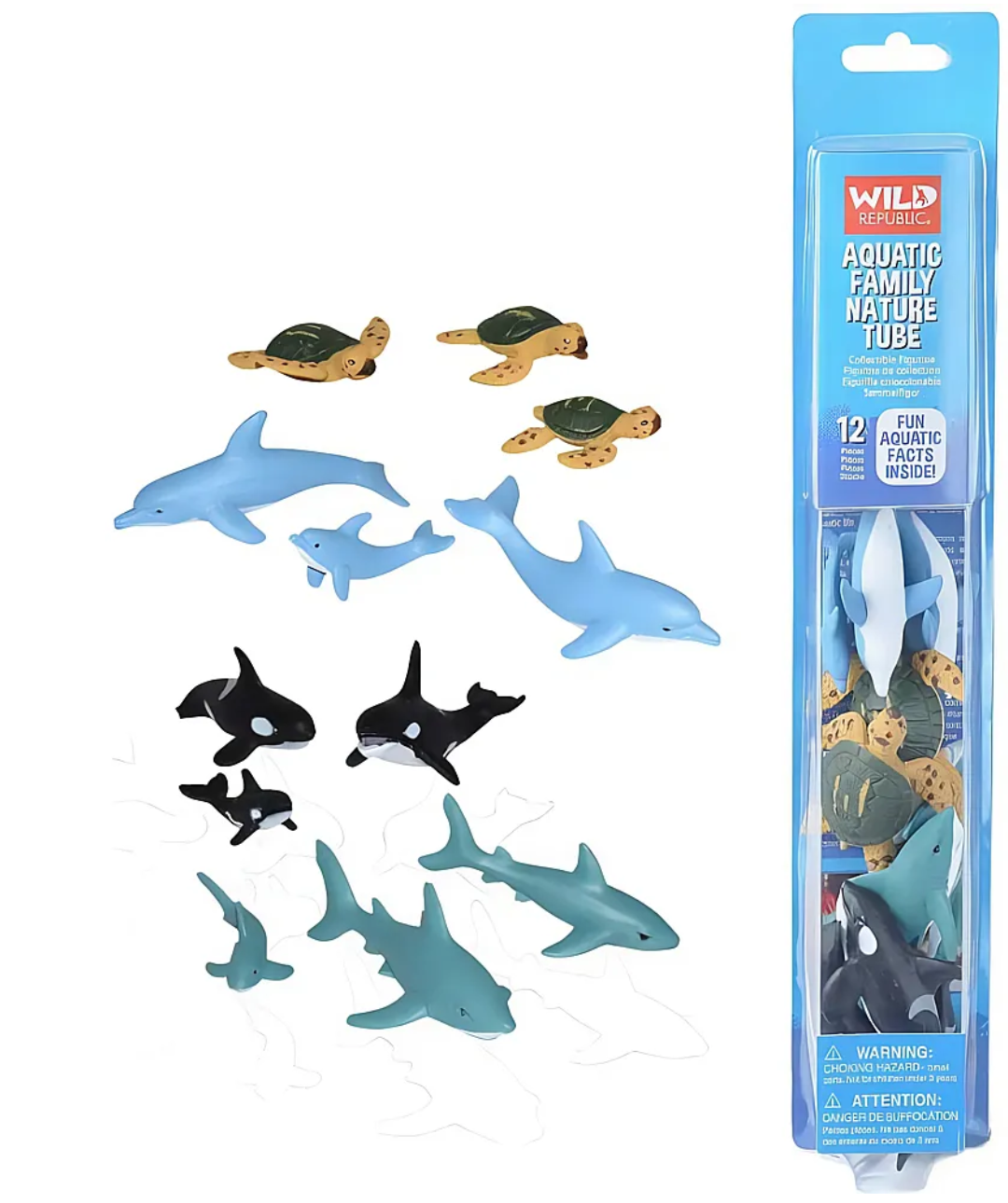 Un tubo ripieno di… famiglie oceaniche! Tre tartarughe, tre delfini, tre orche e tre squali. 12 creature oceaniche perfette da usare con acqua o sabbia, nella schiuma o in altre proposte di gioco sensoriale. Dai 3 anni.