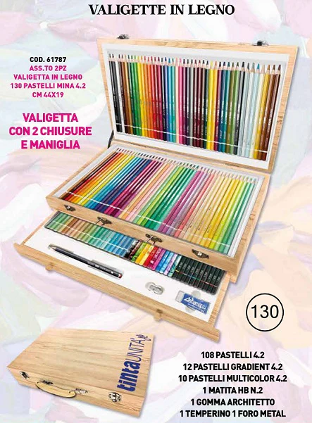 Valigetta in legno Tinta Unita Art, con all’interno: 108 Pastelli Tinta Unita 4.2 12 Pastelli Tinta Unita Gradient 4.2 10 Pastelli Multicolor 4.2 1 Matita HB n. 2 1 Gomma Architetto 1 Temperino 1 foro Metal Misura Valigetta: cm. 44×19 con 2 chiusure a maniglia.