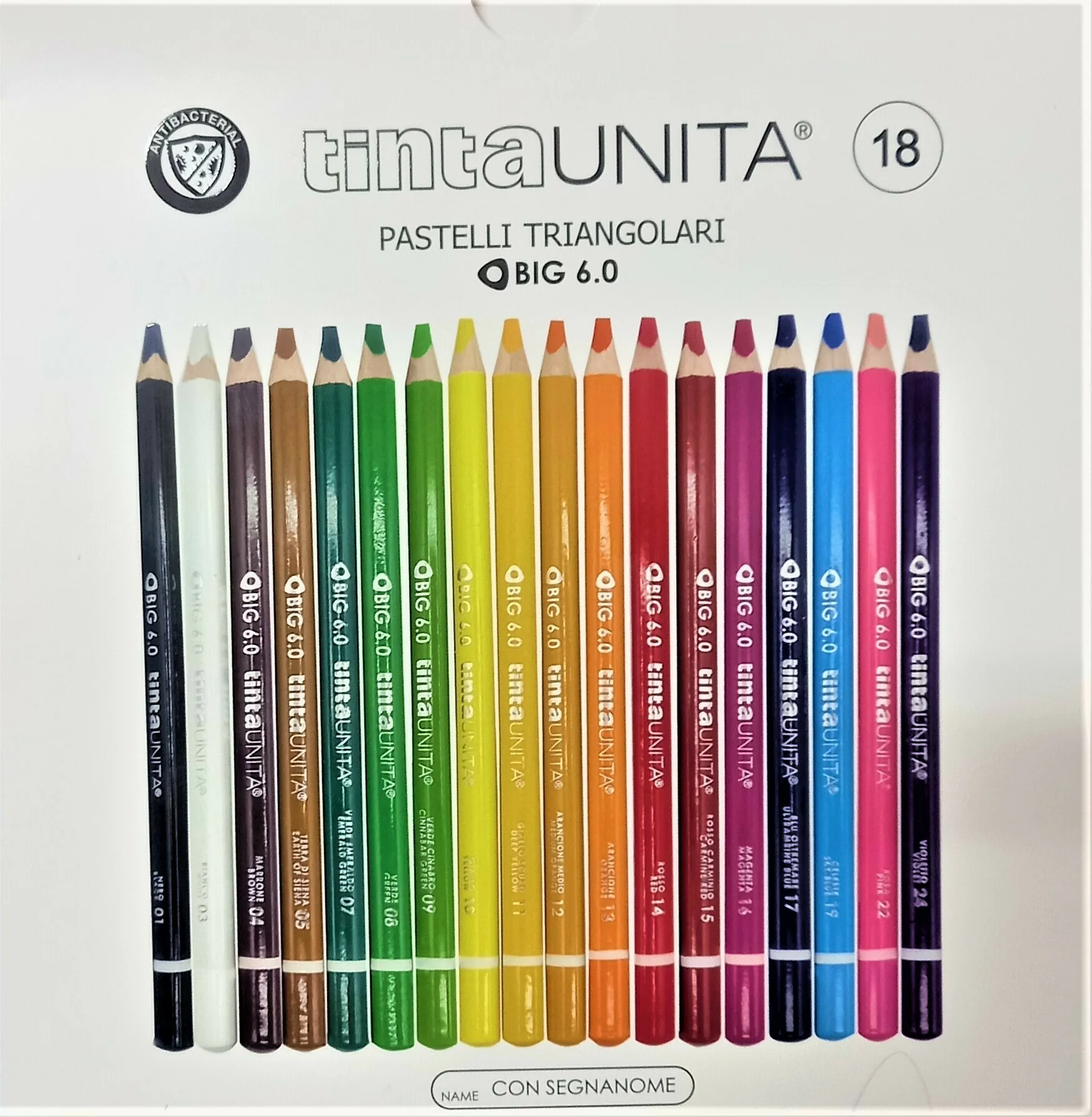 Pastelli Colorati Tinta Unita Big 6.0 con Fusto Triangolare personalizzabile con una normale penna. Fusto di forma Triangolare di grosse dimensioni per un impugnatura semplificata ai Bambini. Mina da 6 mm super resistente e facile da temperare. Fusto dello stesso colore della mina.