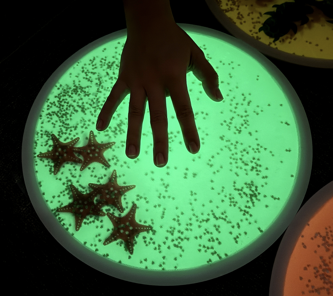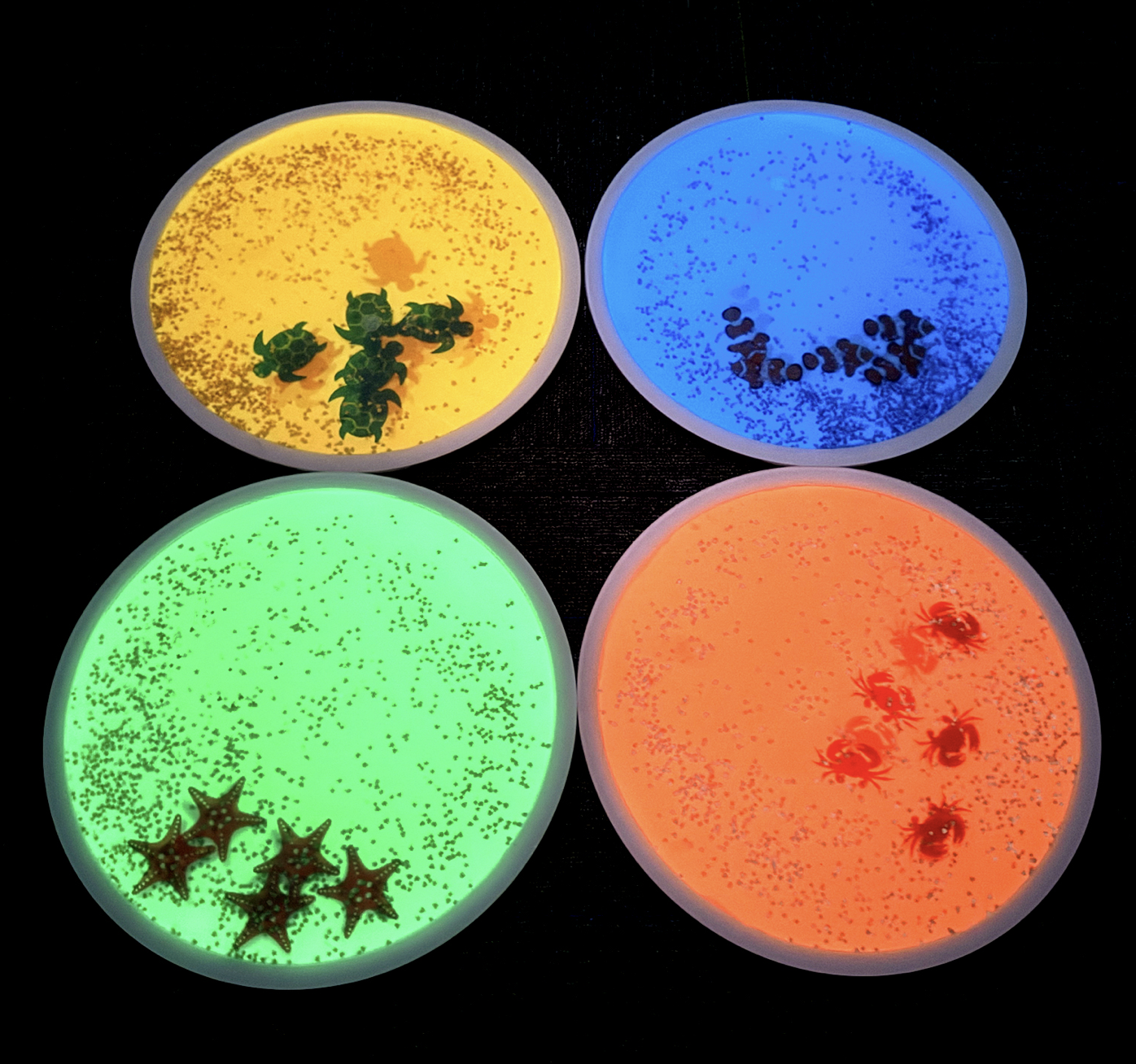 Piccolo set di 4 piastrelle con liquido e oggetti al loro interno, sensibili alla luce UV: perfette da usare in sala Snoezelen o in uno spazio oscurato, insieme alla torcia UV che trovi sul nostro shop.