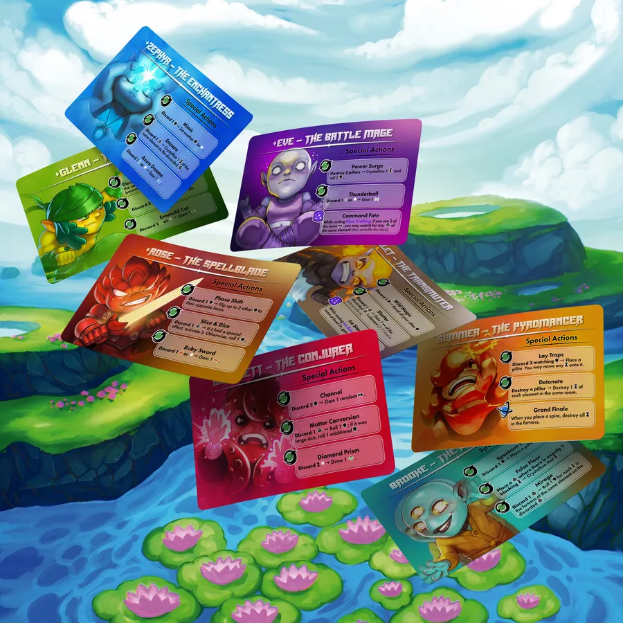 Tu e i tuoi compagni assumerete il ruolo di eroi di Elementis, lavorando insieme per plasmare il potere elementale in quattro guglie, una per ogni elemento: terra, aria, fuoco e acqua. Una guglia è un insieme di quattro tessere, una sopra l’altra, tutte dello stesso elemento. Ogni volta che completate una guglia, il demone eterico di quell’elemento viene sconfitto. Una volta sconfitti tutti e quattro i demoni eterei, gli eroi condividono una gloriosa vittoria, avendo ripristinato l’equilibrio nel regno di Elementis!