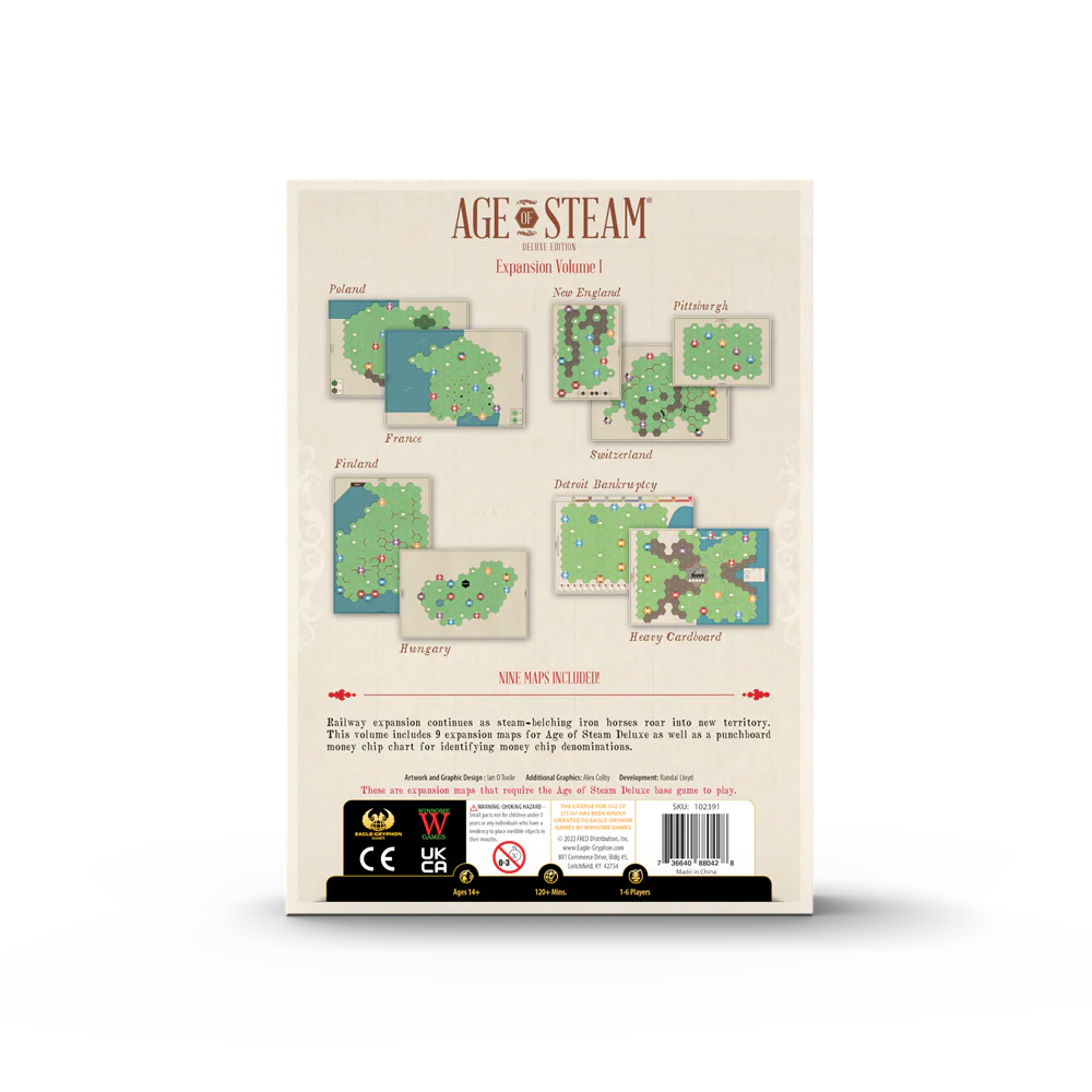 Il Volume I include le 9 mappe precedentemente disponibili per Age of Steam Deluxe (Francia / Polonia, Ungheria / Finlandia, Nuova Inghilterra / Svizzera / Pittsburgh, Heavy Cardboard / Detroit Bankruptcy) e una tabella per identificare i tagli delle chips.