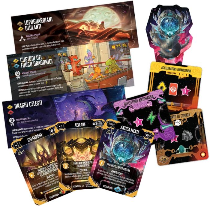 ℹ️ Exotic Mattier contiene gli addon di gioco della campagna Kickstarter. Elementi di Gioco: 3 Fazioni 3 Tessere Miglioria Nave 48 Moduli (Metamorfici, Obliterati ed Esplosivi) 1 Carta + 1 Figura Predone Alveare 1 Carta + 1 Figura Predone Vespa 1 Carta + 1 Figura Predone Antica Mente 3 Basi in plastica