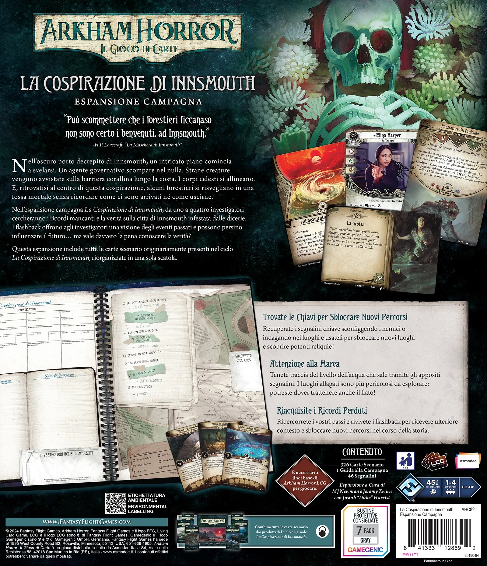 Questa espansione include tutte le carte scenario originariamente presenti nel ciclo La Cospirazione di Innsmouth, riorganizzate in una sola scatola.