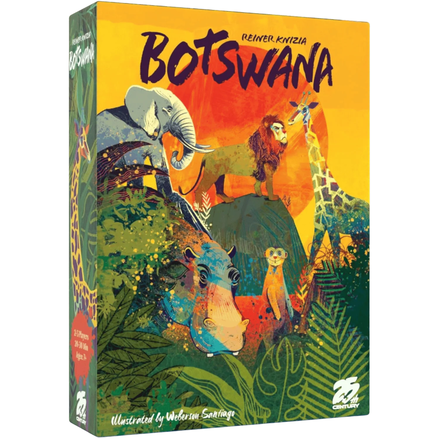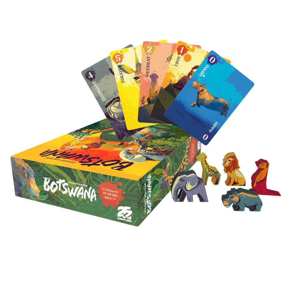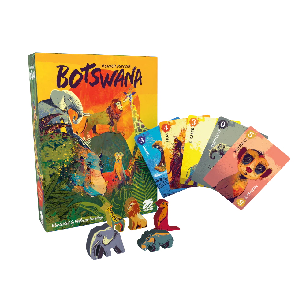 Botswana / Wildlife Safari è stato originariamente pubblicato come Flinke Pinke. Questo gioco è uno di quei giochi “dolorosamente semplici” di Reiner Knizia. Ci sono cinque fiches di colore diverso, con sei carte, da zero a cinque, per ogni colore. Le carte vengono distribuite e i giocatori a turno giocano una carta e prendono una qualsiasi fiche disponibile. Quando un colore ha tutte e sei le carte giocate su di esso, la partita termina e i giocatori usano l’ultima carta giocata in ogni categoria per valutare le proprie fiches. Il valore totale più alto vince.