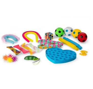 set di fidget contenente: -4 palline sticky -1 push popper -2 sensory pop tubes -4 marble fidget -2 fidget tracks -4 spinner a forma di palla -2 animali stretch -1 portachiave peapod -2 noodles -1 mini fidget spinner -1 puzzle cube Dai 3 anni