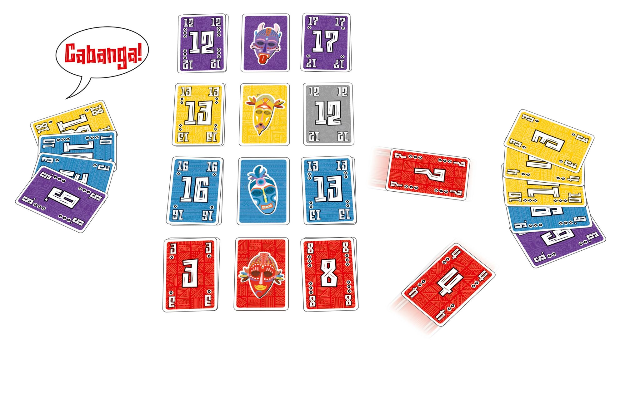 In Cabanga! dovrai posizionare le tue carte con attenzione, cercando di non lasciare intervalli numerici scoperti: se lo fai, gli altri giocatori potranno gridare “Cabanga!” e lanciarti le loro carte per metterti in difficoltà!