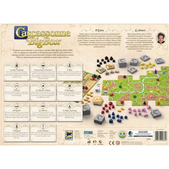 Carcassonne – Big Box Edizione 2022 è la scelta ideale per chi desidera immergersi completamente nel mondo di Carcassonne. Questa edizione speciale include il gioco base e ben 11 espansioni, di cui 7 esclusive per questa scatola. Con nuovi personaggi e regole, ogni partita diventa una sfida unica e coinvolgente. Carcassonne è un classico dei giochi da tavolo, amato da milioni di giocatori in tutto il mondo e con una storia di oltre vent’anni. Questo gioco strategico, immediato ma profondo, è perfetto per ogni età e ideale anche per due giocatori. L’edizione 2022 non apporta modifiche al regolamento o ai contenuti, ma presenta aggiornamenti grafici alla copertina e al regolamento.