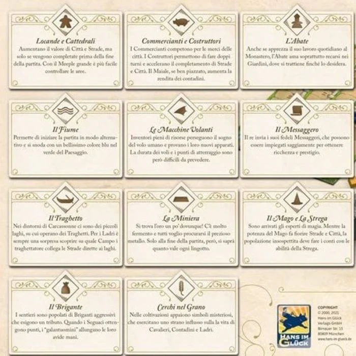 1) Locande e Cattedrali – Aumentano il valore di Città e Strade, ma solo se vengono completate prima della fine della partita. Con il meeple grande è più facile controllare le aree.