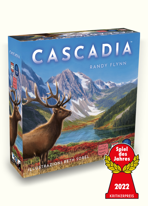 In Cascadia™, i giocatori competono per creare l’ambiente più diversificato del Pacifico nord-occidentale mentre scelgono le Tessere Habitat e i Segnalini Fauna Selvatica per costruire un bellissimo mosaico paesaggistico. Ogni partita di Cascadia™ presenta combinazioni uniche di obiettivi di punteggio legati a ciascuna delle cinque specie di fauna selvatica presenti: Orso Grizzly, Alce di Roosevelt, Salmone Chinook, Falco dalla Coda Rossa e Volpe Rossa.