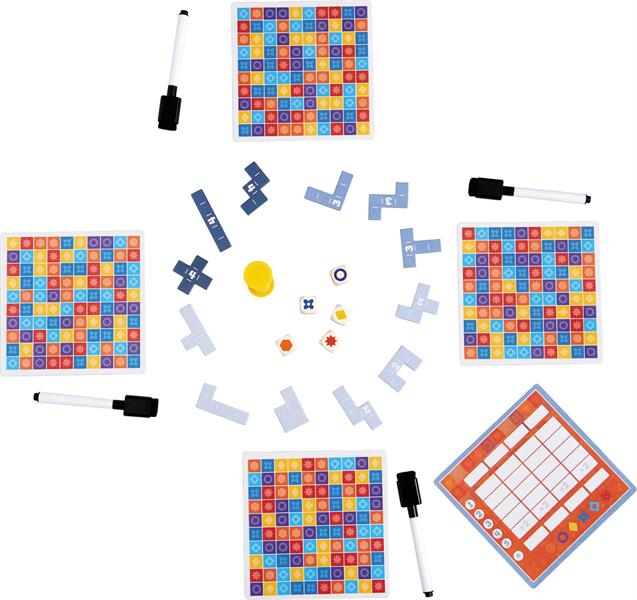 5 dadi, 5 giri, 5 simboli. Cercate contemporaneamente – a tempo – cinquine in varie disposizioni sulla griglia e tracciatele con il pennarello. Vince il gioco chi, dopo 5 giri, ha ottenuto piu’ punti. Dai 7 ai 99 anni 1-4 giocatori