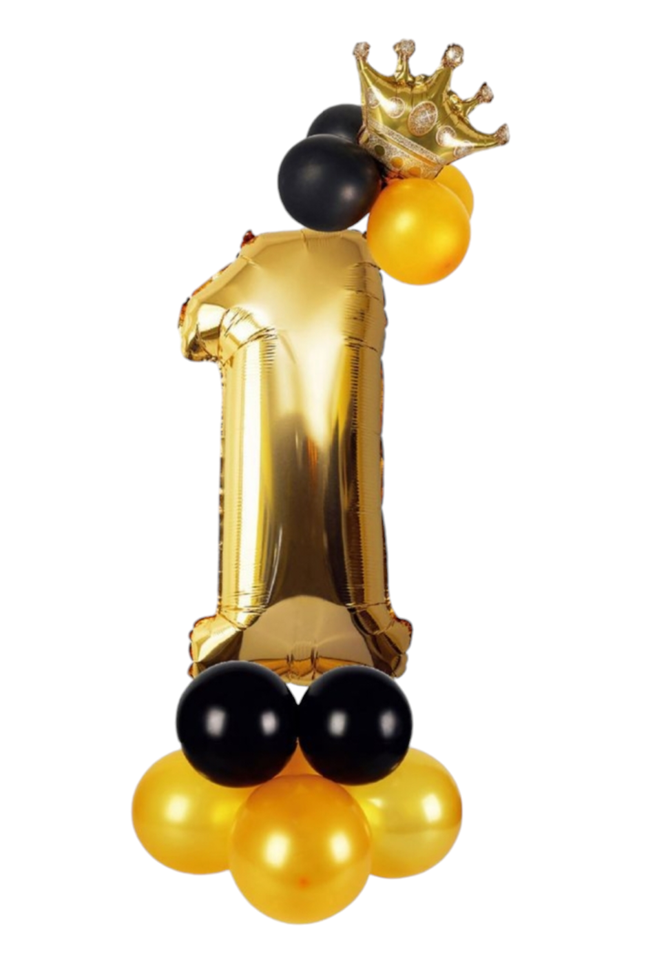 Composizione di palloncini in lattice neri e oro con numero 1 in mylar oro e corona.