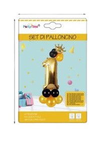 Composizione di palloncini in lattice neri e oro con numero 1 in mylar oro e corona. L’altezza totale è di circa 170 cm. Il set contiene tutto l’occorrente per la realizzazione per un totale di 38 pezzi. Festa di Compleanno
