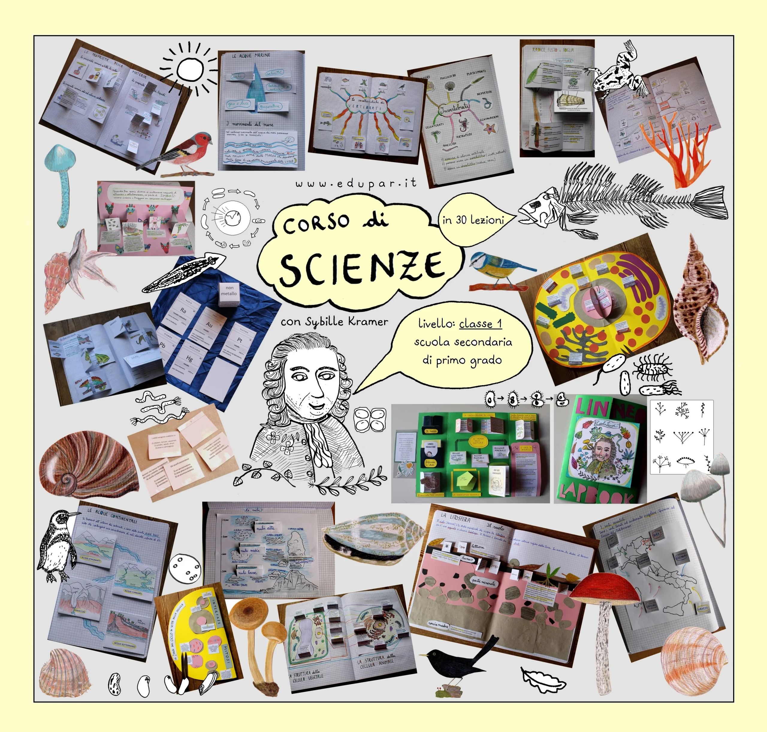 Questo corso affronta gli argomenti di Scienze della prima classe della scuola secondaria di primo grado in 30 lezioni attraverso varie proposte: pagine di quaderno da realizzare in modo originale con l’aiuto di parti apribili, elementi da utilizzare nella costruzione di mappe riassuntive, testi da completare, un lapbook su Carlo Linneo e un lapbook sulla cellula animale, giochi di carte e spunti che invitano a fare esperienze dirette nella natura e nell’ambiente che ci circonda.