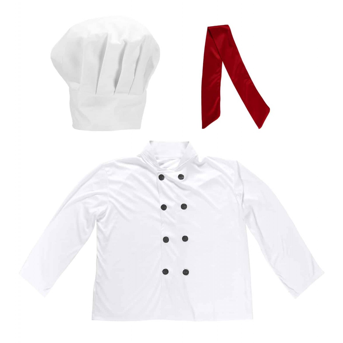 Set da Cuoco composto da: maxi cappello, foulard rosso e casacca, il tutto in stoffa di buona qualità. Taglia unica