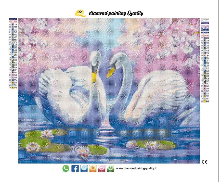 Il nostro diamond painting i due cigni, è una tela full-square AB; completamente ricoperta di diamanti a sezione quadrata con l’aggiunta di Aurora Borealis iridescenti.