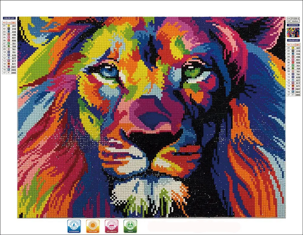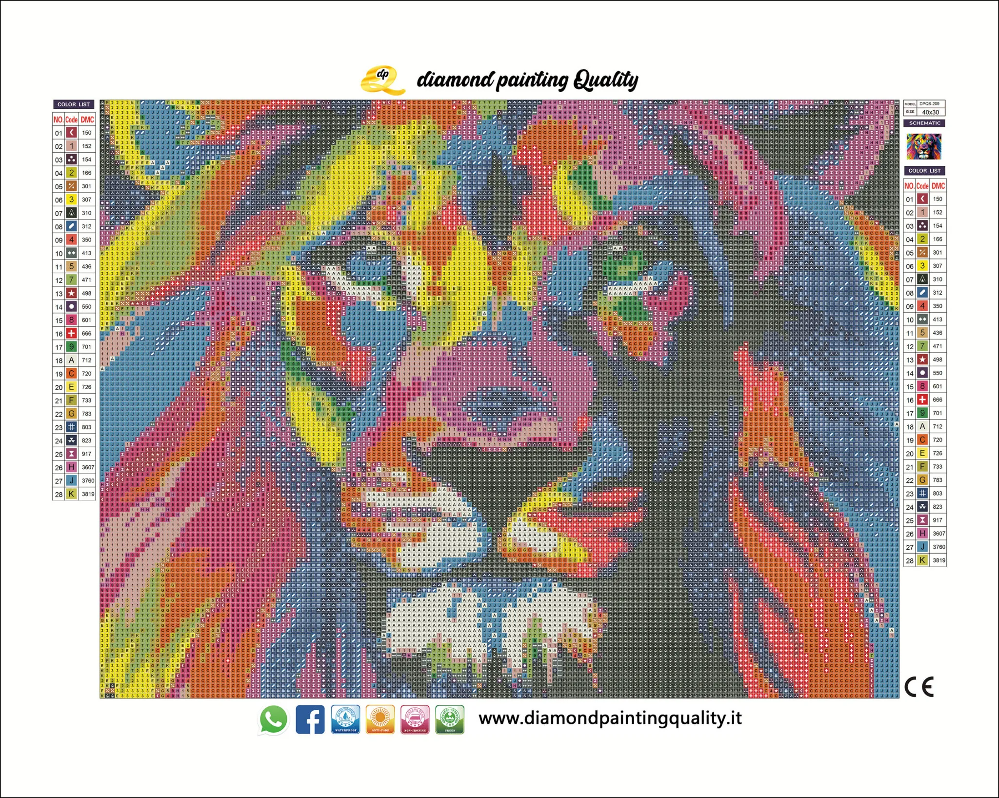 Il nostro diamond painting Lion Multicolor, è una tela full-square; completamente ricoperta di diamanti a sezione quadrata.