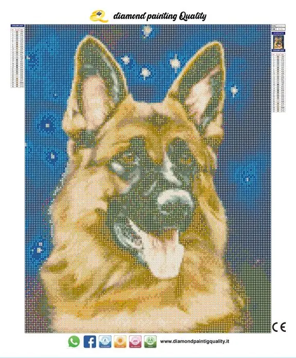 Diamond painting Pastore Tedesco Il nostro diamond painting Pastore Tedesco, è una tela full-round; completamente ricoperta di diamanti a sezione rotonda. Diamond Painting Cod. DPQ3436-R40X50cm Dimensione immagine 40 x 50 cm. Dimensione tela 50 x 60 cm.