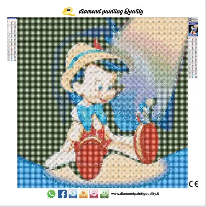 Diamond painting Pinocchio Il nostro diamond painting Pinocchio, è una tela full-round; completamente ricoperta di diamanti a sezione rotonda. Diamond Painting Cod. DPQ3427-R40X40cm Dimensione immagine 40 x 40 cm. Dimensione tela 50 x 50 cm.