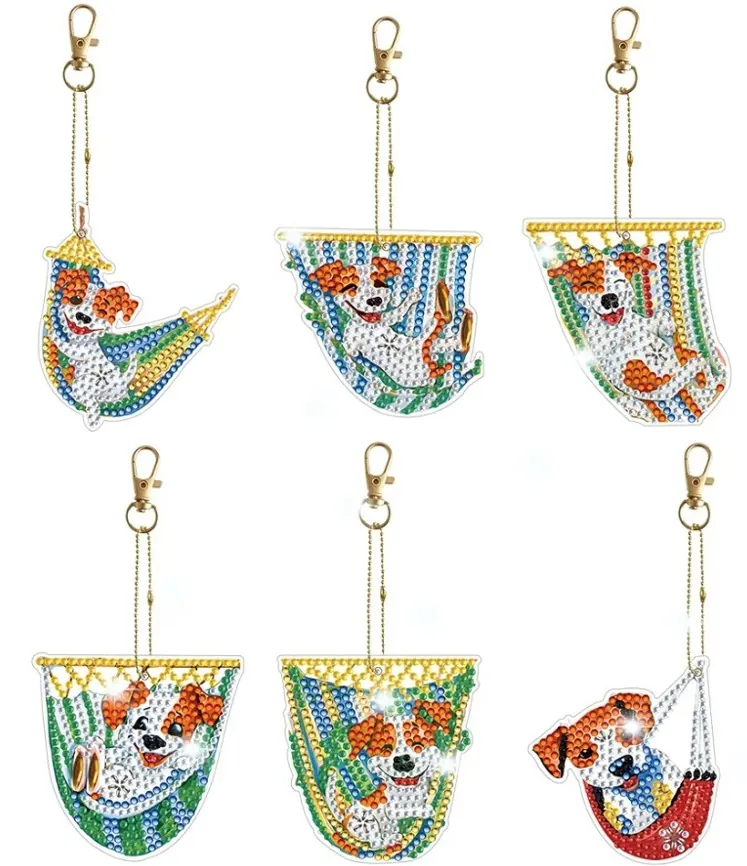 Diamond Painting Portachiavi Cani Relax Il nostro diamond painting Portachiavi Cani Relax è composto da un set di 6 portachiavi di differenti forme e di varie colorazioni. Verrà fornito di kit completo di lavoro per la realizzazione. Diamond Painting Portachiavi Cod. DPQ-PC032