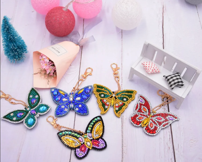 Diamond painting Portachiavi Farfalle. Il nostro diamond painting Portachiavi Farfalle è composto da un set di 5 portachiavi, a forma di farfalla e di varie colorazioni, che viene fornito completo di kit di lavoro per la realizzazione. Diamond Painting Portachiavi Farfalle Cod. DPQ-PC008
