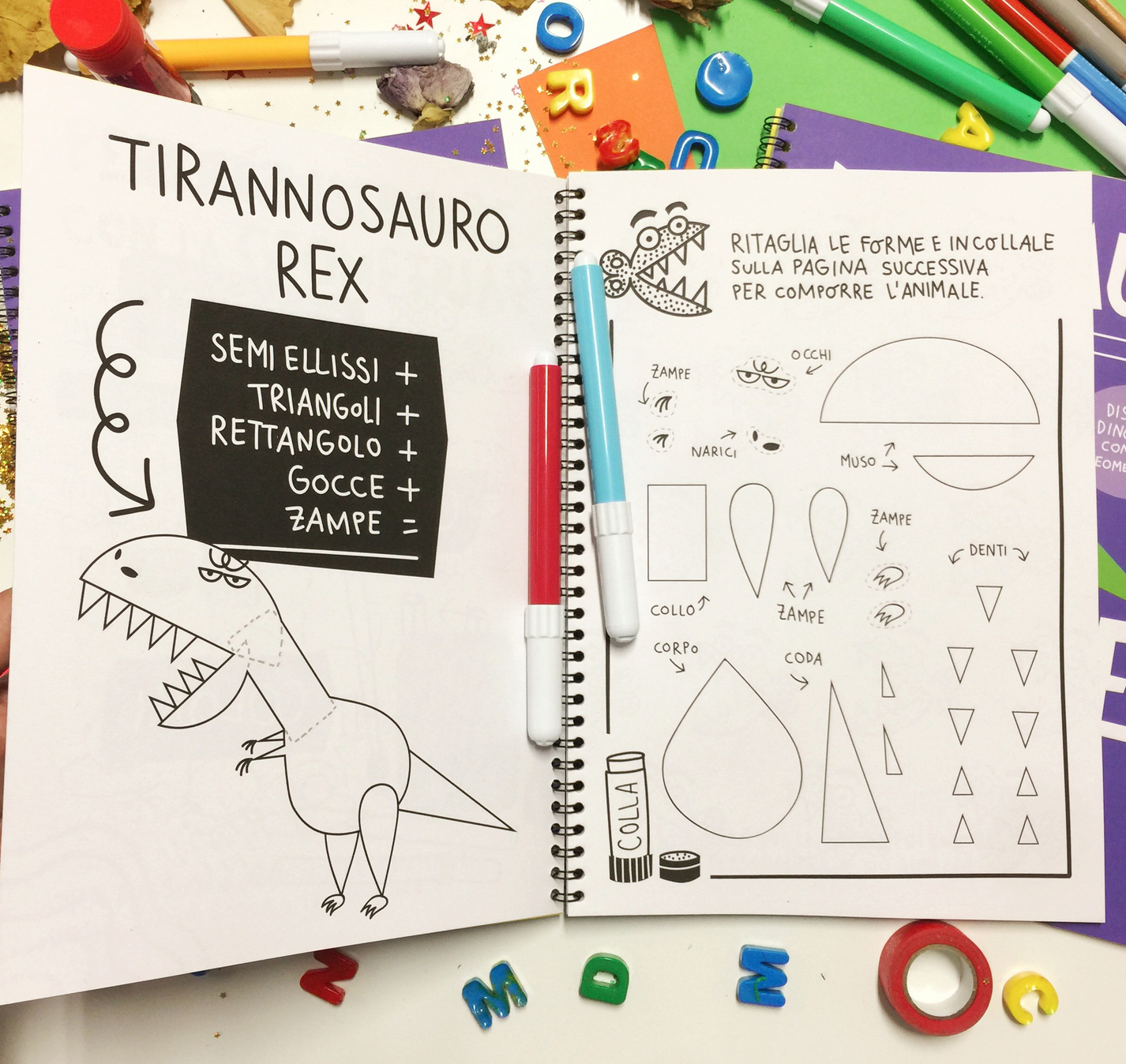 Impara a disegnare i dinosauri grazie alla geometria, attraverso il ritaglio e il collage. Ogni dino è stato scomposto in forme semplici: cerchi, ellissi, rettangoli, triangoli… che vanno ritagliati e incollati fino a ricostruire l’interno animale e, infine, colorarlo.