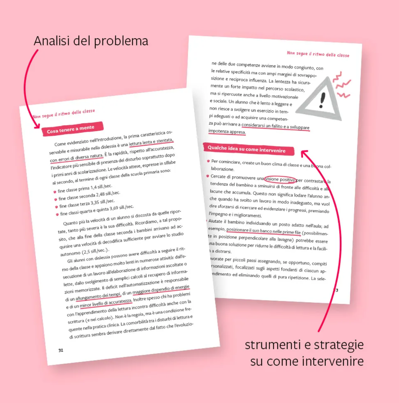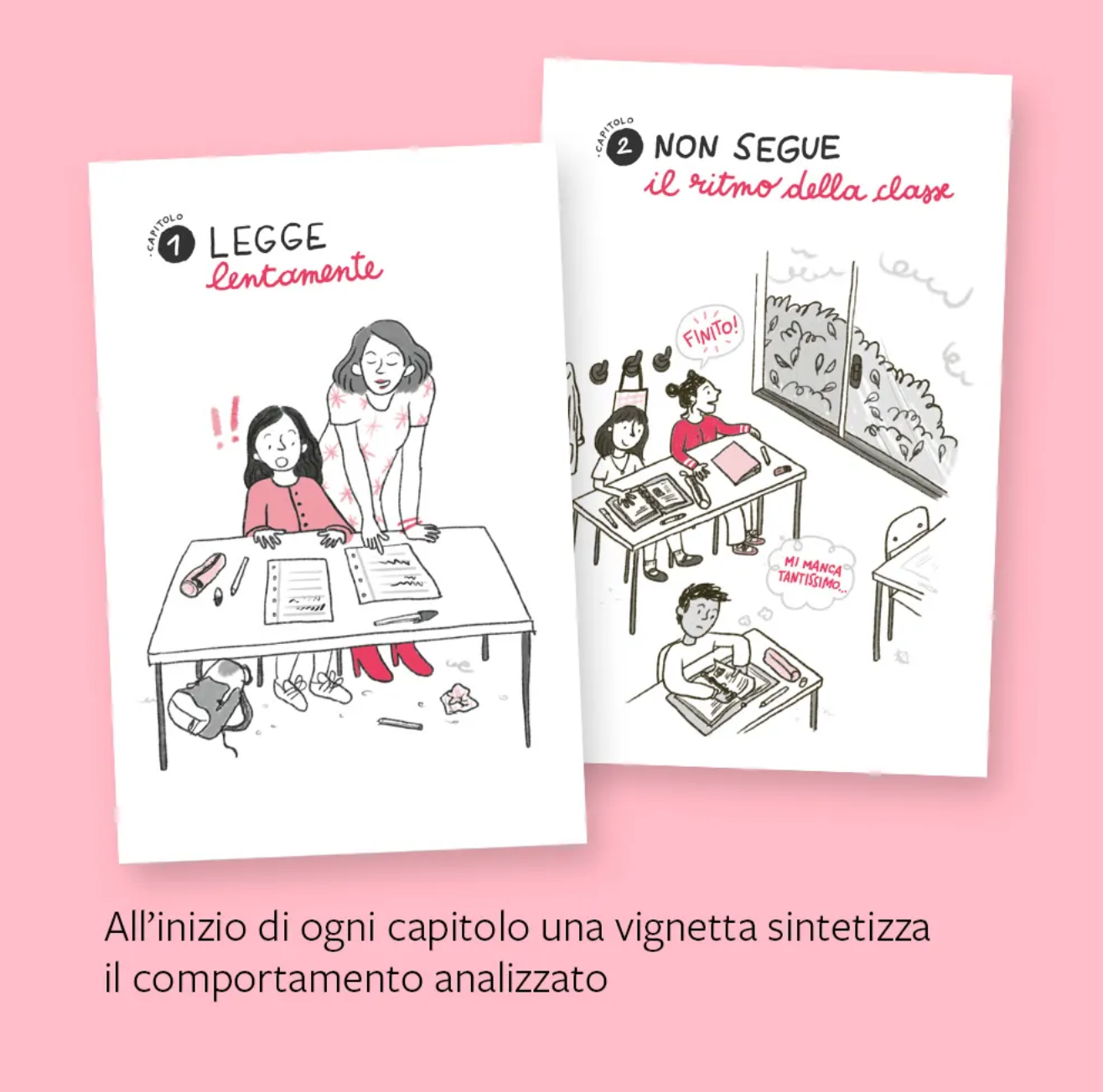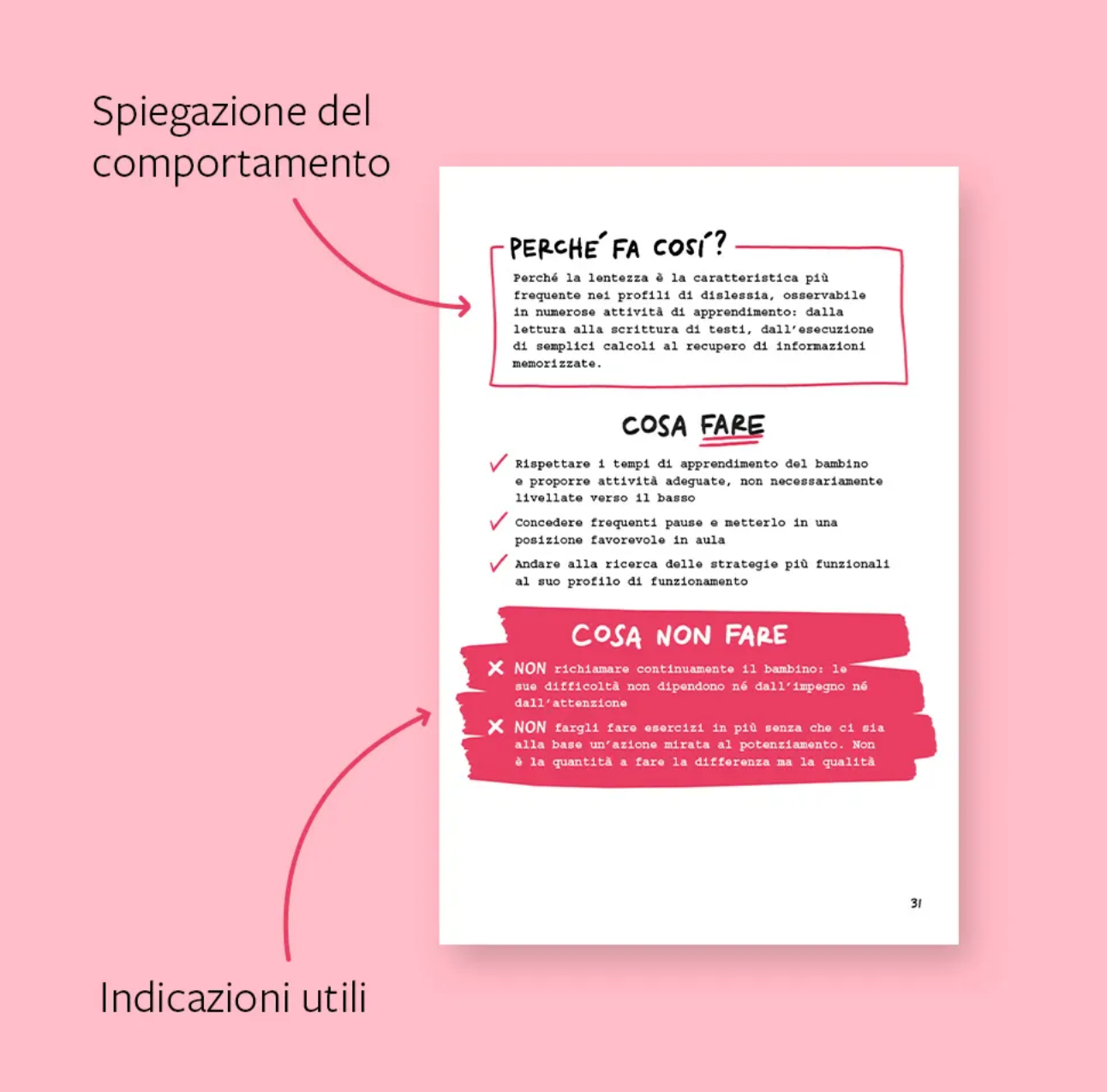 Il motivo di ogni comportamento viene all’inizio spiegato in poche sintetiche frasi (Perché fa così?), a cui seguono indicazioni semplici e chiare per l’insegnante sugli atteggiamenti da adottare e da evitare (Cosa fare, Cosa NON fare). Segue un approfondimento sul tema (Cosa tenere a mente) e vengono forniti strumenti e strategie su come intervenire.