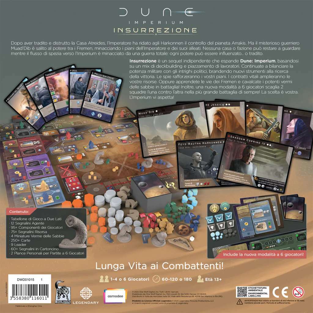 DUNE: IMPERIUM – INSURREZIONE è un gioco di costruzione del mazzo e piazzamento lavoratori che trae ispirazione dagli elementi e dai personaggi della saga di Dune, da entrambi i film della Legendary Pictures e dalla serie di romanzi best seller di Frank Herbert, Brian Herbert e Kevin J. Anderson.
