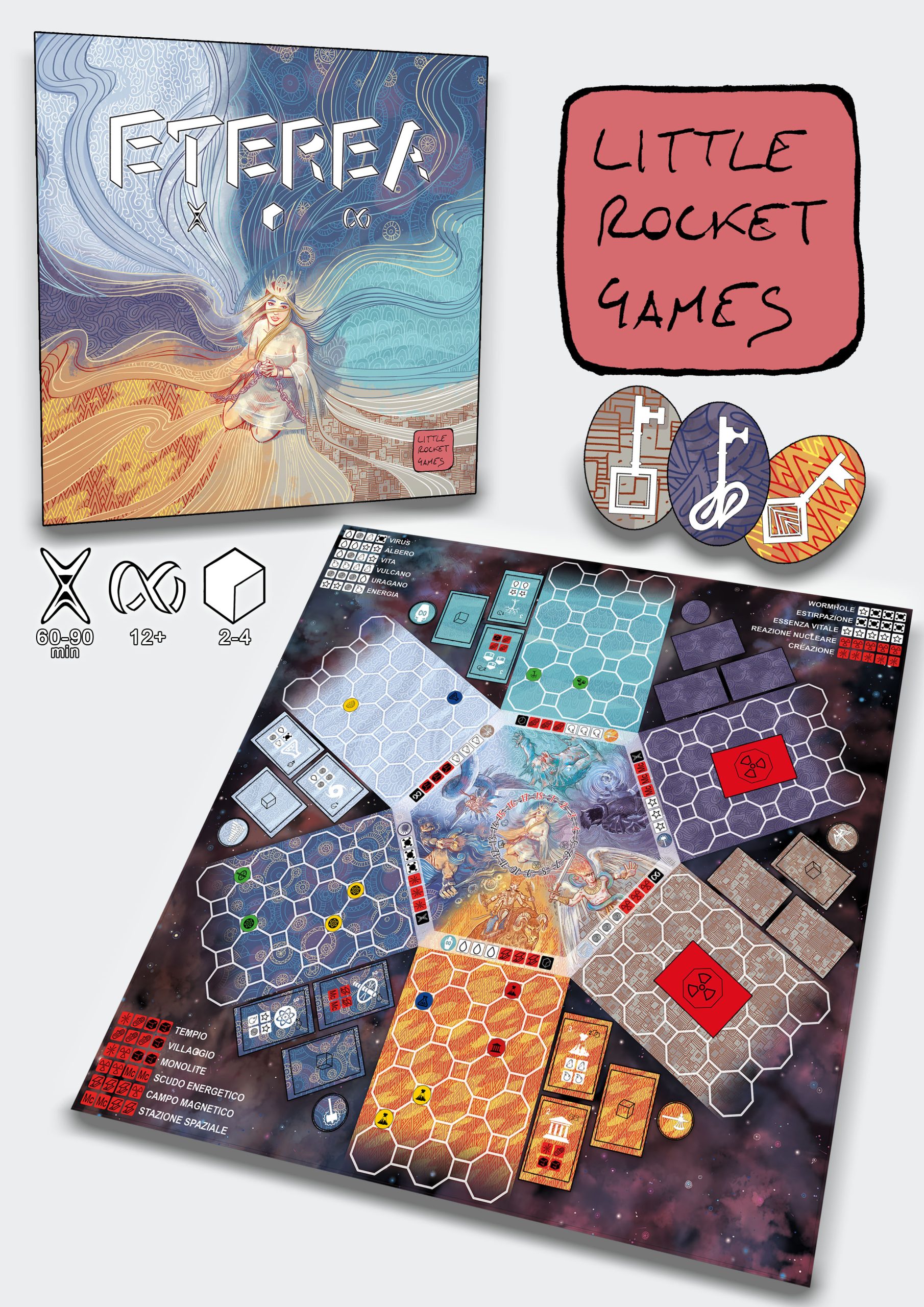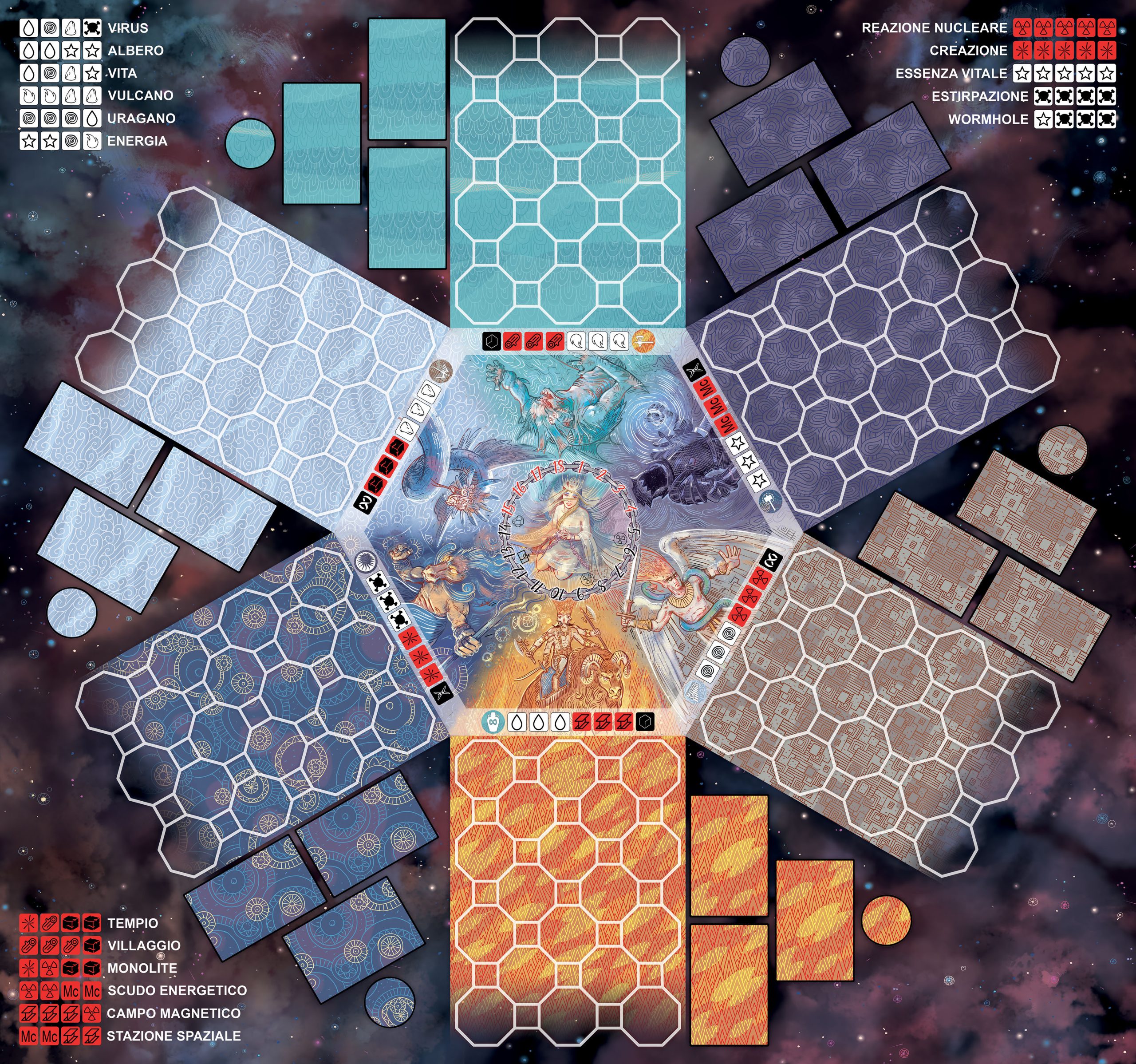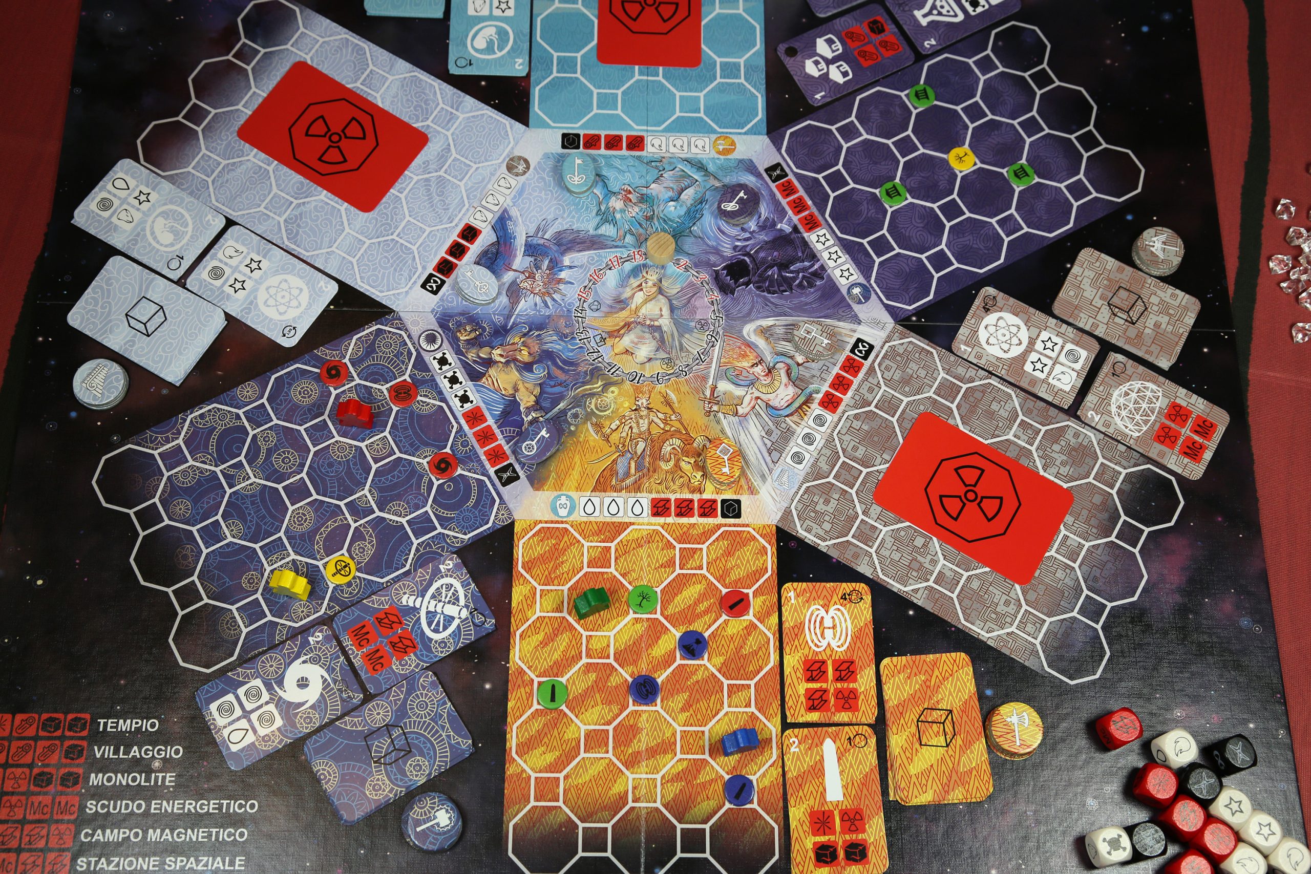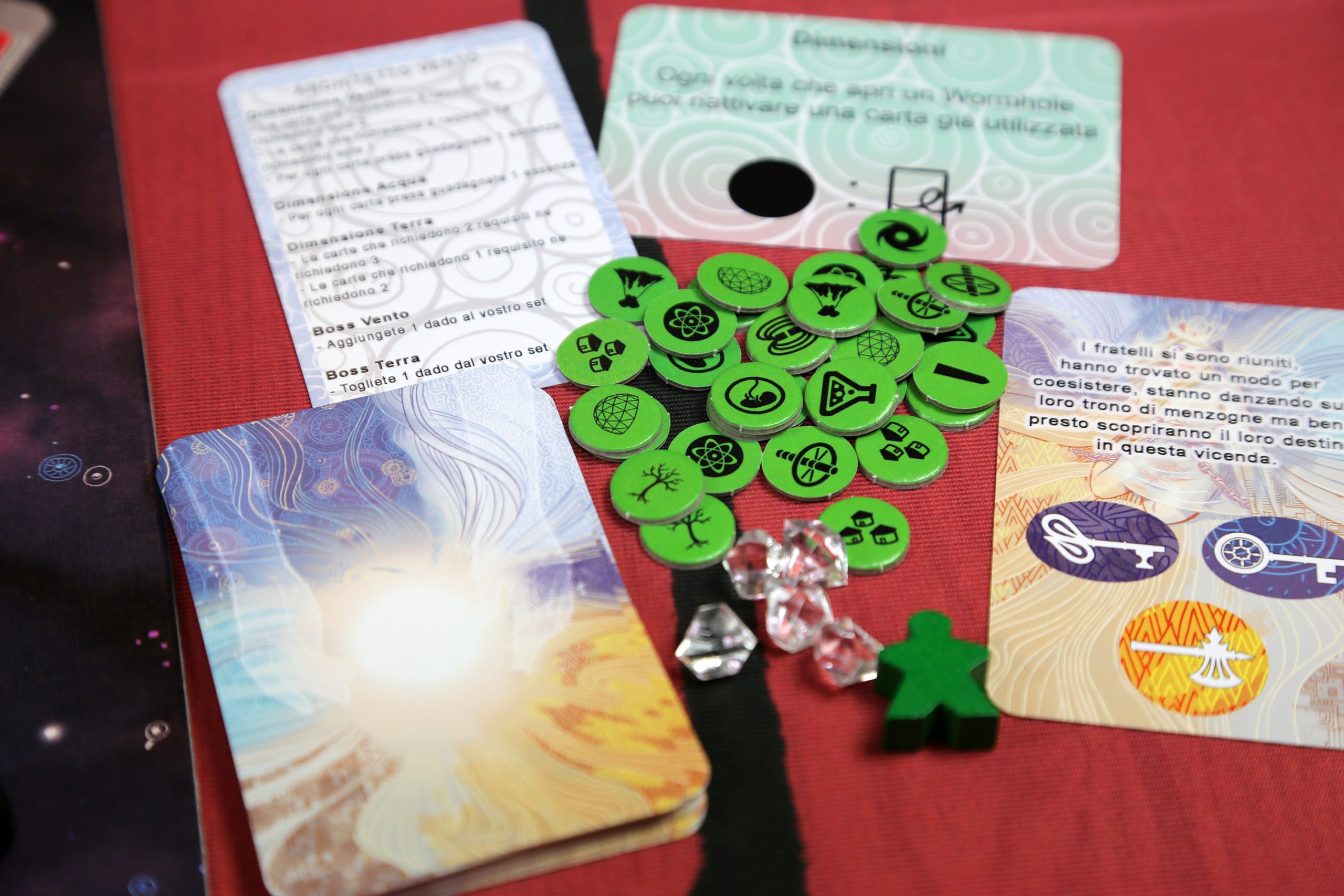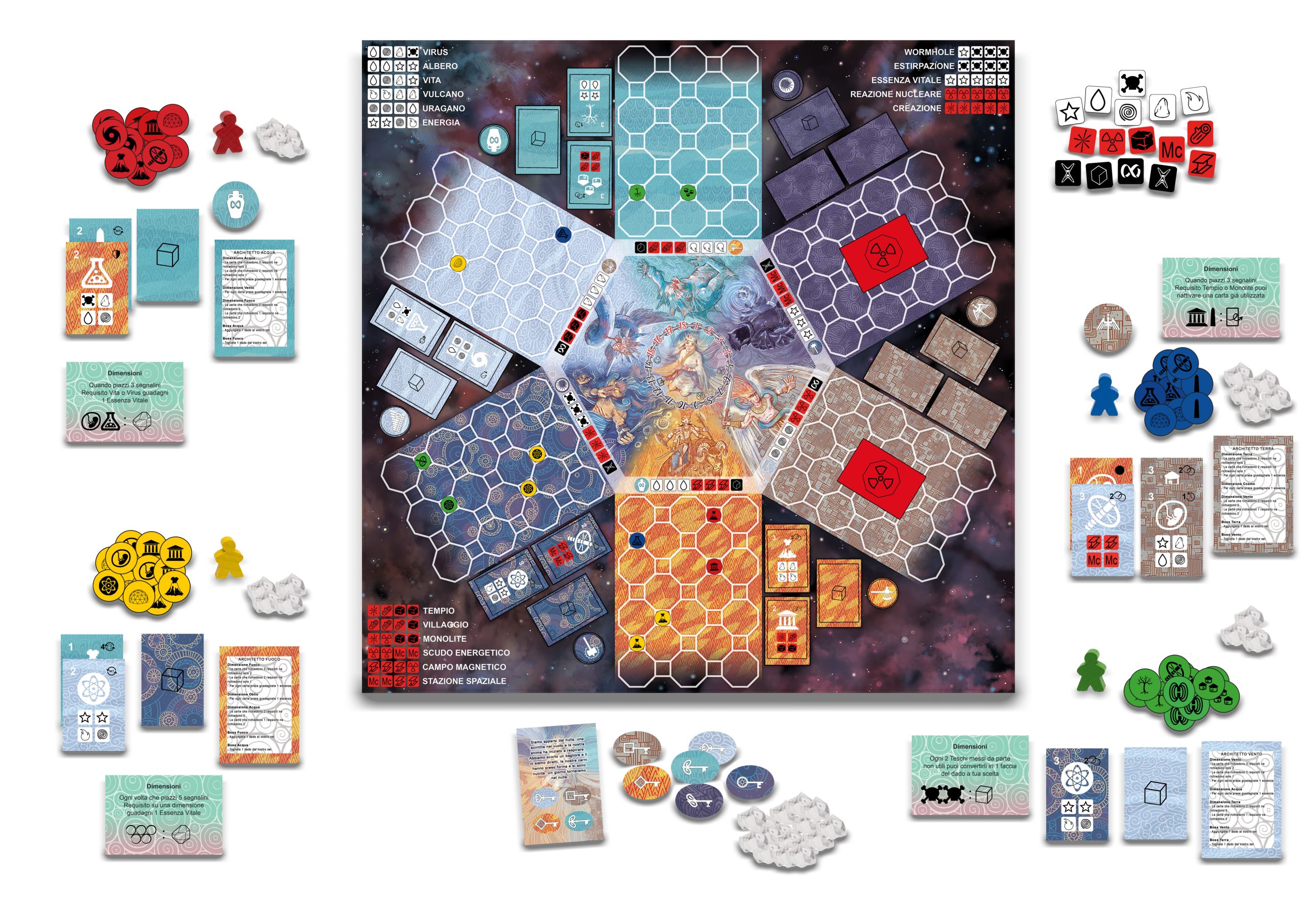 40 Gemme Essenza Vitale, 4 Pedine Architetto, 1 Cilindro Segnatempo, 24 Segnalini Artefatto, 24 Segnalini Chiave, 144 Segnalini Requisito, 6 Dadi Elementali, 6 Dadi Costruttore, 4 Dadi Dimensionali, 48 Carte Requisito, 18 Carte Risoluzione, 6 Carte Architetto, 6 Carte Dimensione Chiusa, 18 Carte Vocazione, 1 Plancia di Gioco.