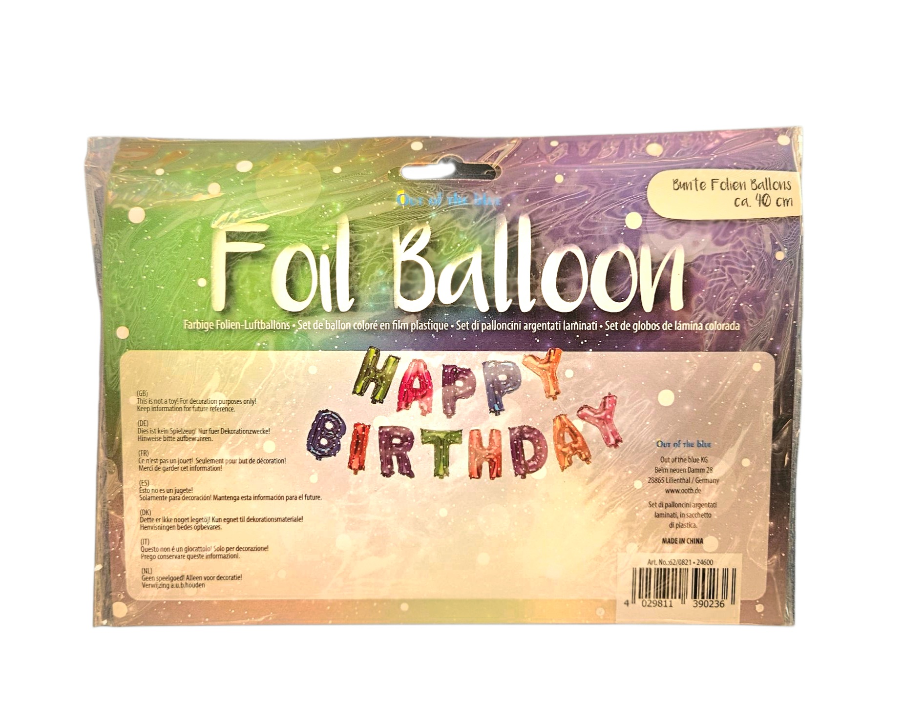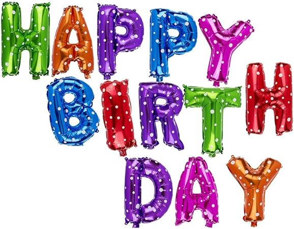 Festone “Happy Birthday” composto da lettere in foil alte circa 40 cm. Le lettere sono lucide in vari colori con pois, predisposte di occhielli per essere appese. Gonfiaggio ad aria con pompetta o cannuccia. Festa di Compleanno.