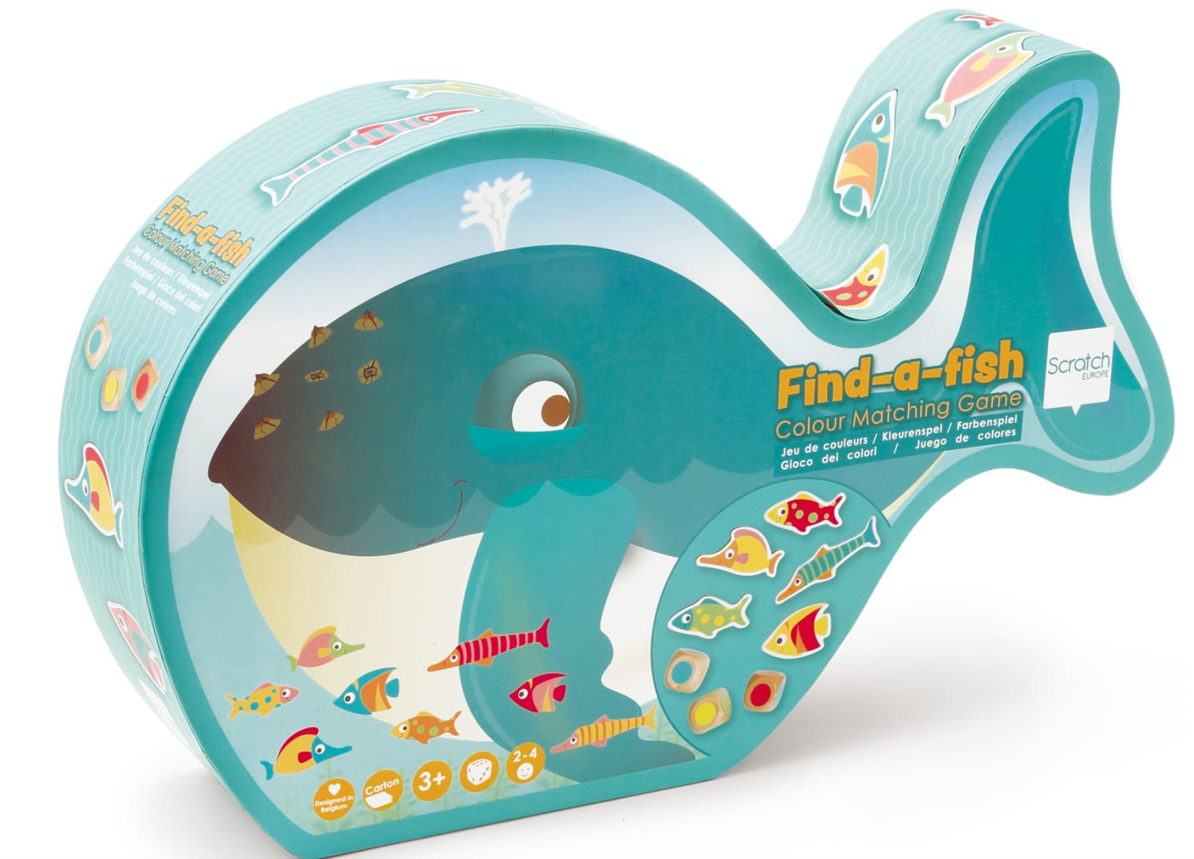 Nel mare nuotano molti bellissimi pesci colorati. Lancia una combinazione di colore con tre dadi e trova gli stessi colori in un unico pesciolino. Se non ne trovi nessuno, passa il turno. Chi raccoglie piu’ pesciolini, vince. Dai 3 anni, 2-4 giocatori. Materiali in cartone, contiene tre dadi in legno