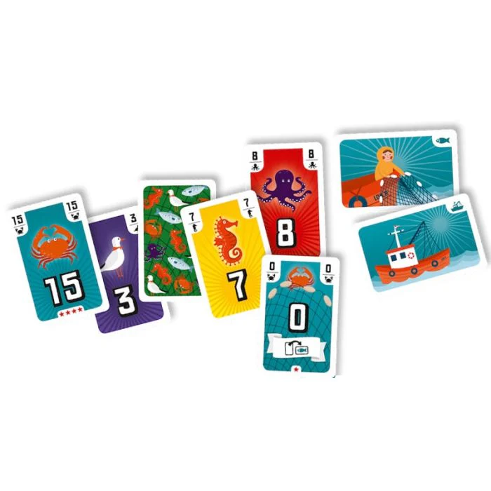 In Fishing , cerchi di catturare più prese possibili in otto round, con ogni carta che catturi che vale 1 punto. Quindi usi le tue carte catturate per il round successivo e se non hai catturato abbastanza prese per riempire la tua mano, pescherai nuove carte dalla pila dell’oceano, che introdurranno nuove carte per cui i tuoi pescatori dovranno combattere.