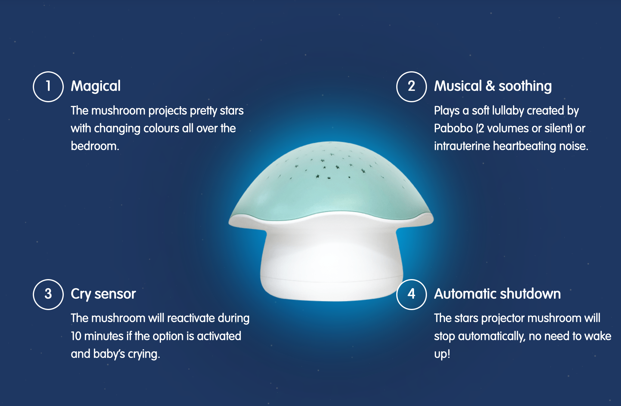 Lampada a forma di fungo, proietta stelle sul soffitto. Proiezione in 3 colori. La lampada ha la funzione sensore del pianto (disattivabile) che permette di riattivarsi automaticamente al pianto del bambino. Produce inoltre una dolce ninna nanna per promuovere l’addormentamento (disattivabile) oppure un rumore bianco che ricorda il suono percepito all’interno dell’utero. La proiezione è […]
