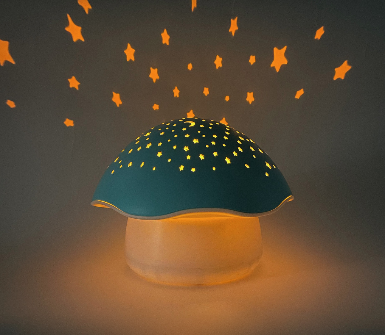 Lampada a forma di fungo, proietta stelle sul soffitto. Proiezione in 3 colori.