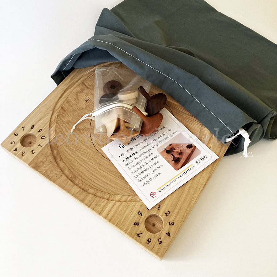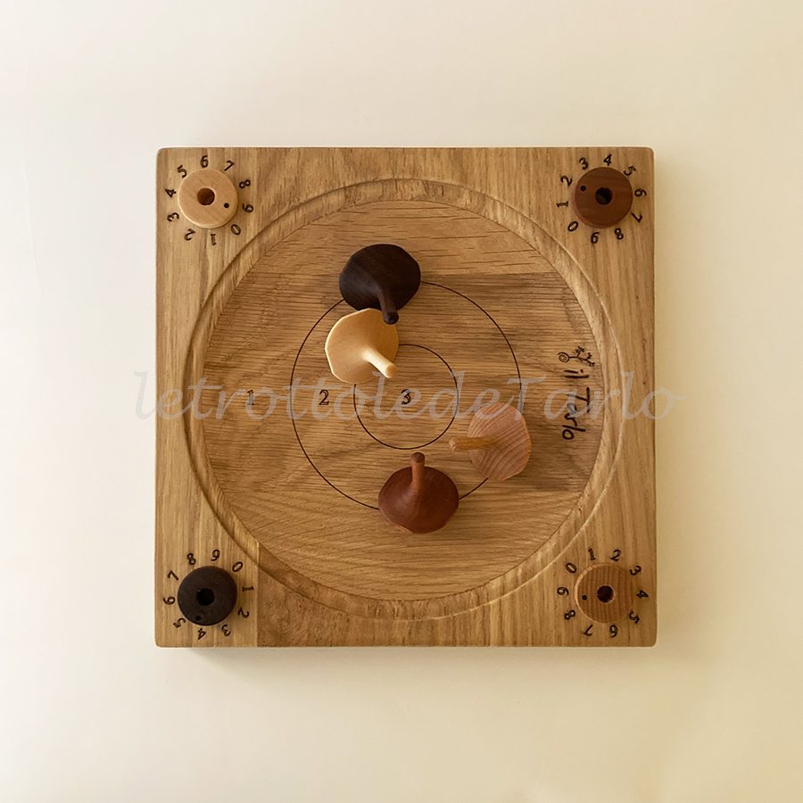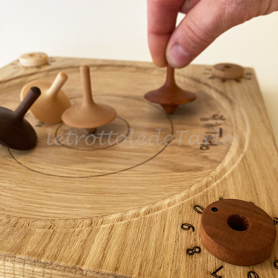 MATERIALI: piatto gioco in rovere, trottole e segnapunti in essenze varie: acero, faggio, ciliegio e noce