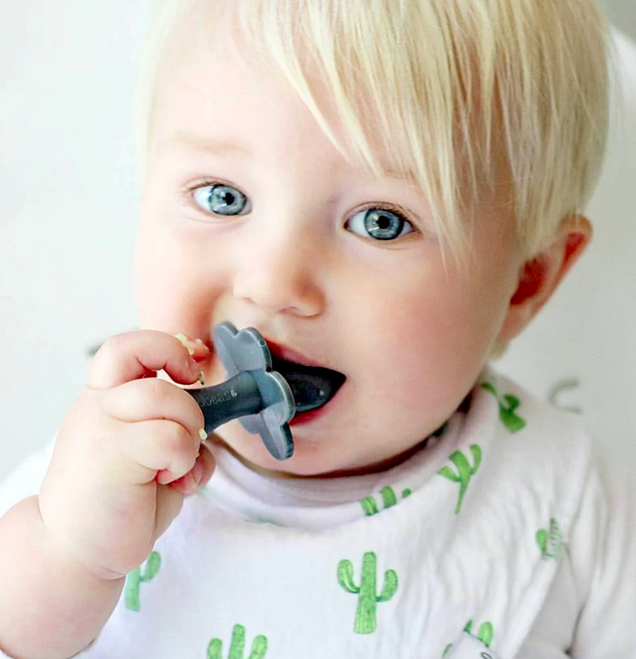 La presa a pomello tondeggiante e la lunghezza ridotta, oltre all’area che limita il morso, sono soluzioni che derivano dall’osservazione di bambini piccoli a tavola.