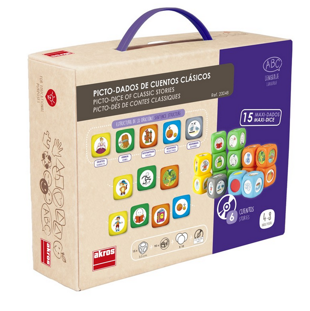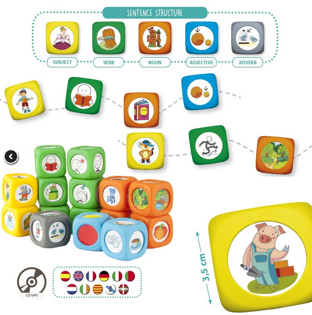 15 maxi dadi per raccontare tante storie, ogni dado di colore diverso rappresenta: soggetto, verbo, nome, aggettivo, avverbio. Così è facile iniziare a familiarizzare con la costruzione della frase! Include un cd con 6 storie classiche in diverse lingue (tra cui tedescom francese, italiano e inglese).