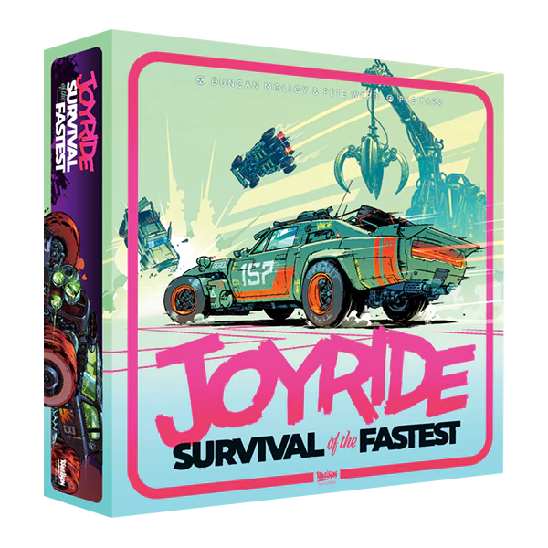 Joyride: Survival of the Fastest è un gioco da tavolo esplosivamente divertente, basato su corse caotiche, veloci e ad alta interazione per due o quattro giocatori. Pianifica il tuo percorso in modo tattico, sfida la fortuna per affrontare le curve ad alta velocità e colpisci gli avversari per mandarli fuori strada. Scegli un’auto con abilità uniche che cambiano il tuo stile di gara. Preferisci l’affidabilità del Pilota automatico, la precisione del Freno a mano o il puro caos della Ciambella?