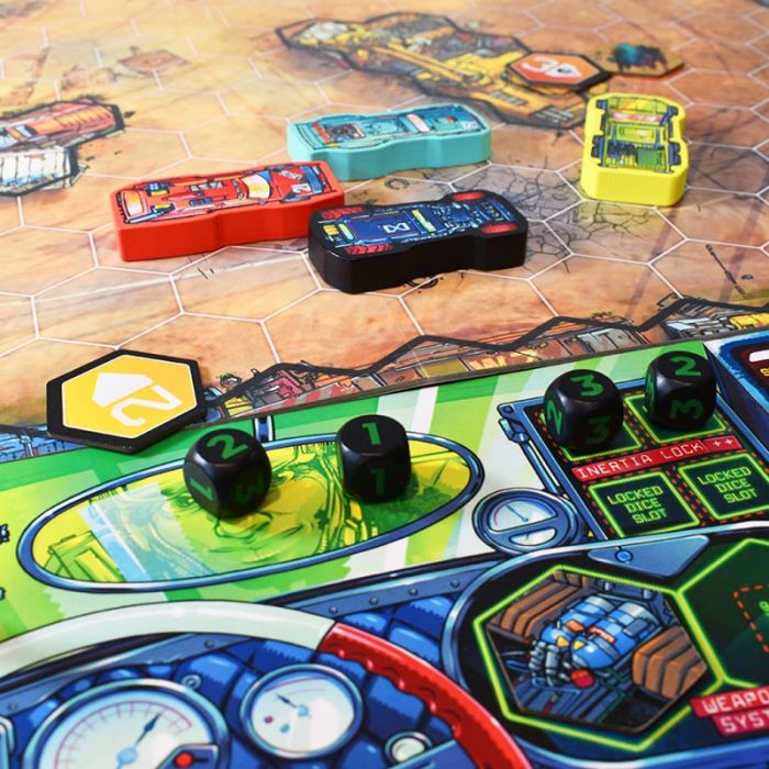 Il cuore del gioco è la manipolazione dei dadi sul tuo cruscotto: puoi bloccare i risultati per avere il massimo controllo o rischiare un nuovo lancio per guadagnare un centimetro in più. Spostati da un checkpoint all’altro attraverso mappe aperte su un tabellone a doppia faccia. Ogni mappa ha tracciati specifici per il numero di giocatori e il livello di abilità. I checkpoint possono essere attraversati da qualsiasi direzione, quindi pianifica una traiettoria che massimizzi le tue possibilità, anche se questo significa sfrecciare nel traffico contromano. Colpisci gli avversari per farli girare o spingerli fuori strada, e raccogli oggetti potenti lungo il percorso. Potrai sparare razzi, far cadere macchie d’olio o persino chiamare attacchi aerei per danneggiare i veicoli nemici. I danni subiti bloccano permanentemente una parte del tuo cruscotto, costringendoti a fare scelte difficili: hai davvero bisogno di due spazi per gli oggetti? O forse è meglio rinunciare alla quinta marcia?