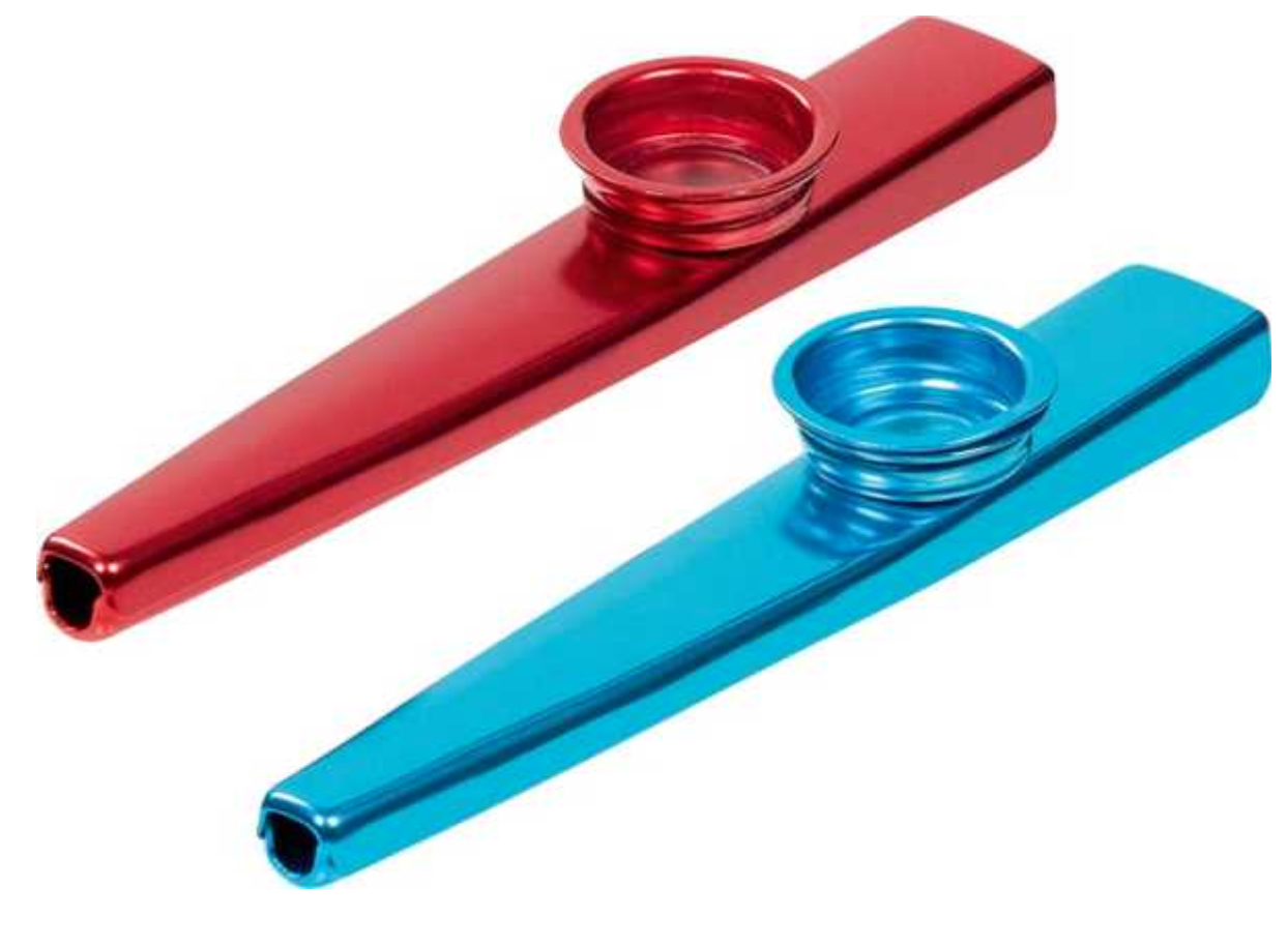 Kazoo in metallo, nei colori blu e rosso assortiti. Fischietti che funzionano con il soffio. Non adatti al di sotto dei 3 anni.