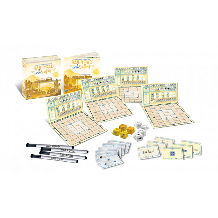 Le Strade d’Inchiostro – Challenge è un Roll and Write per 1-4 giocatori. Tira i dadi e disegna i percorsi per collegare le uscite attorno alla tua lavagnetta cancellabile. Espandi la tua rete con ferrovie, autostrade e stazioni per raccogliere punti, ma verrai penalizzato per qualsiasi collegamento aperto, quindi pianifica attentamente!