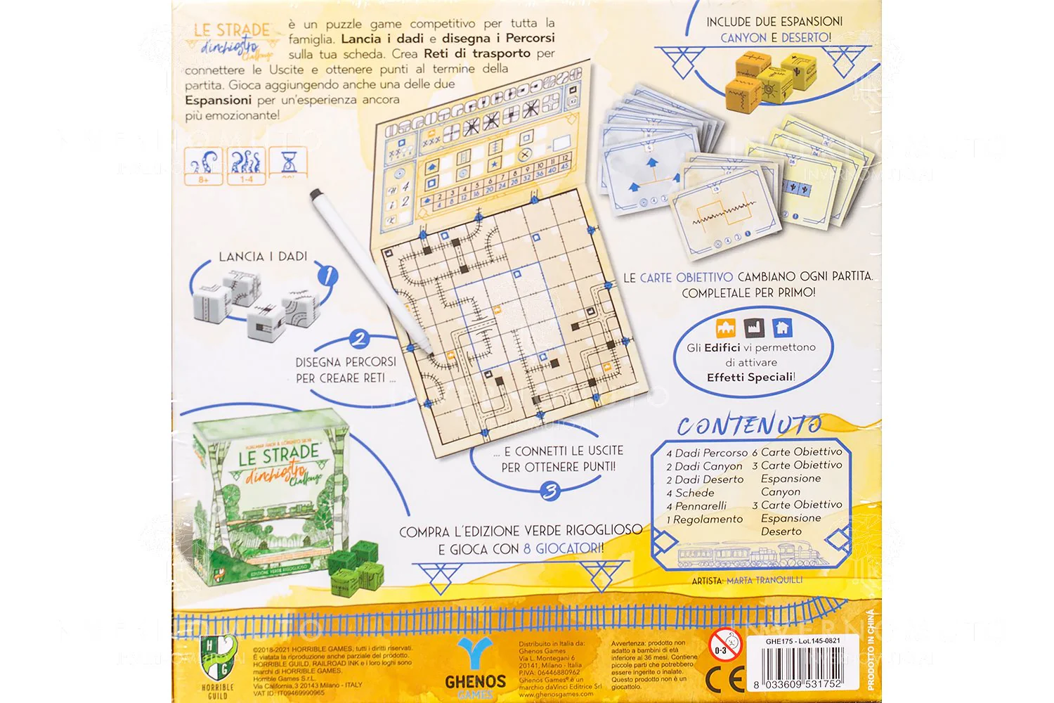 Le Strade d’Inchiostro – Challenge è disponibile in due versioni, ciascuna delle quali include un’espansione con un set di dadi aggiuntivo che aggiunge nuove regole speciali alle tue partite. Usa le oasi per proteggere i tuoi cactus dal clima arido del deserto nella Edizione Giallo Splendente!