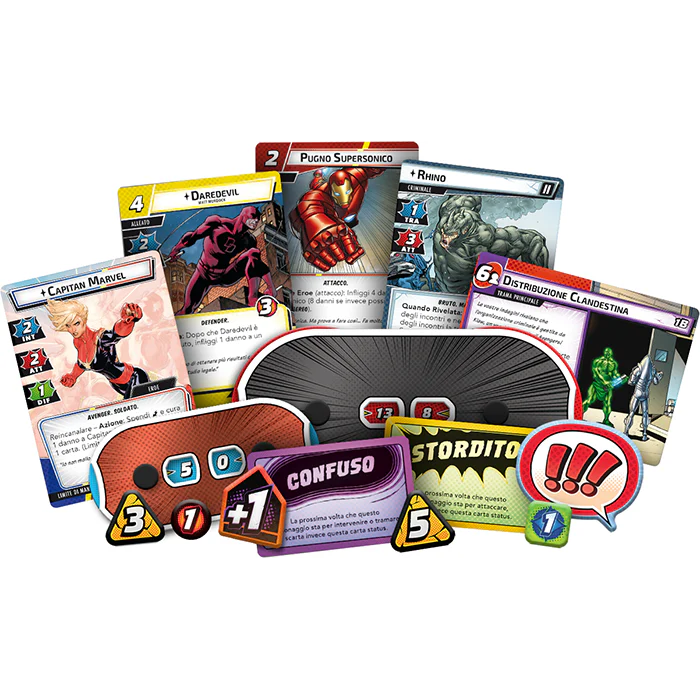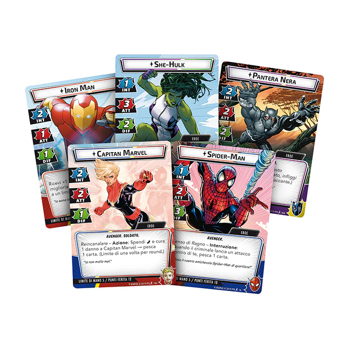 La meccanica di gioco, decisamente snella e dinamica, vi porrà di fronte ad una serie di scelte che turno dopo turno vi permetteranno di sfruttare al meglio le potenzialità del vostro alter ego eroico. Di turno in turno potrete inoltre scegliere se vestire i panni della versione eroica del vostro personaggio, oppure se privilegiare un basso profilo ricorrendo alla vostra identità (più o meno) segreta. Entrambe le versioni hanno diverse azioni da poter effettuare per potenziare la vostra dotazione di poteri, alleati ed equipaggiamenti e così fronteggiare la minaccia del supercriminale. Gli scenari che potrete affrontare sono vari e sfidanti, ma comunque semplici da intavolare, minimizzando i tempi di preparazione e concentrando il gioco sulla parte giocata, piuttosto che sulle fasi preliminari. Il set base, sufficiente in tutto e per tutto per sostenere un gruppo composto fino a 4 giocatori, contiene gli eroi: Iron Man, Capitan Marvel, She-Hulk, Spider-Man e Pantera Nera, mentre i cattivi da affrontare sono Rhino, Klaw e Ultron.