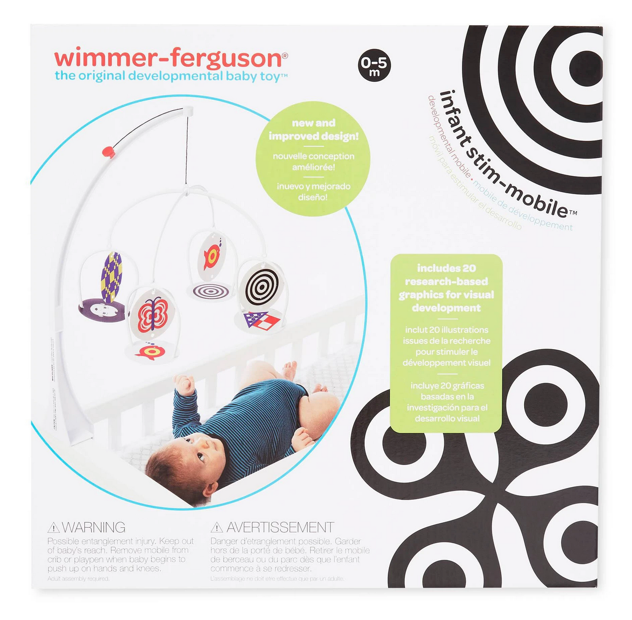 Mobile per lettino ad alto contrasto Wimmer Ferguson. Le tessere sono sostituibili e seguono lo sviluppo visivo del tuo bambino: su ognuna è stampata l’età di riferimento perchè il tuo bambino possa vederle al meglio. Da 0 a 5 mesi. Dimensioni: 66cm quando montato.
