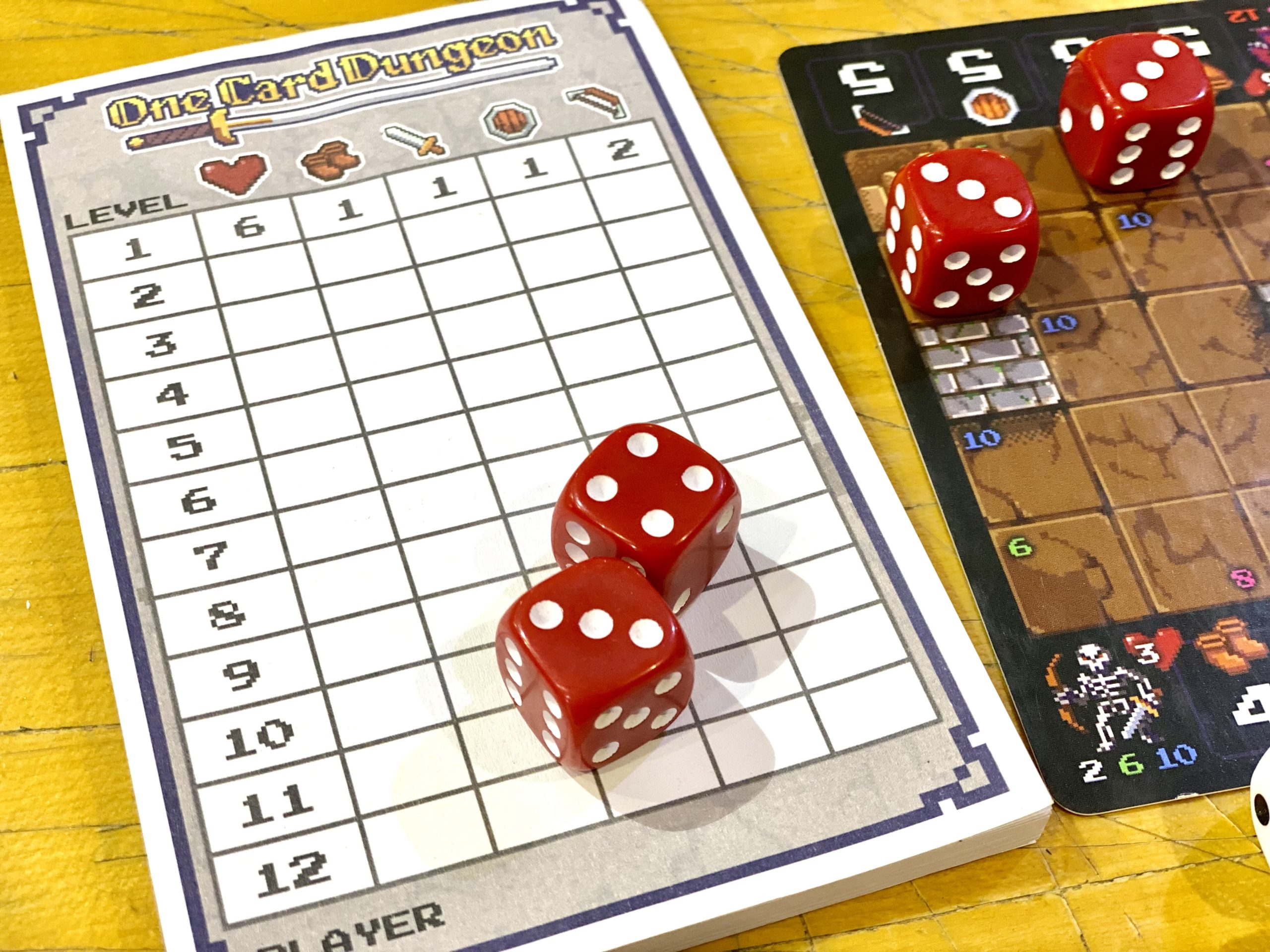 Sia l’avventuriero che i mostri sono rappresentati sulla mappa da dadi con il valore rivolto verso l’alto che mostra la loro salute attuale. In ogni stanza potrete trovare da 1 a 4 mostri. I livelli da superare sono ben 12!