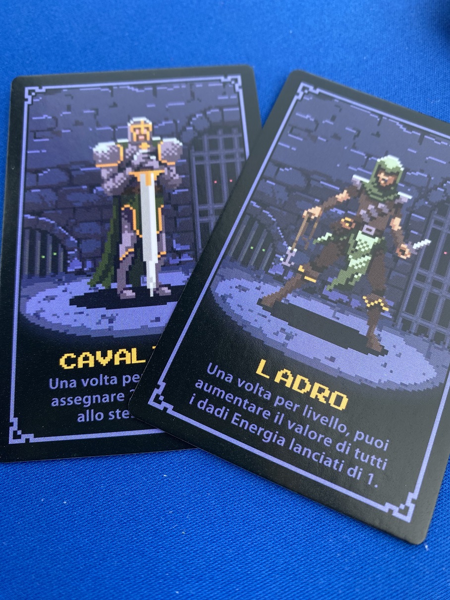 1 carta Dungeon (fronte/retro), 2 carte Classe (fronte/retro), 1 dado giallo Cassa del Tesoro, 1 dado D12 Boss.