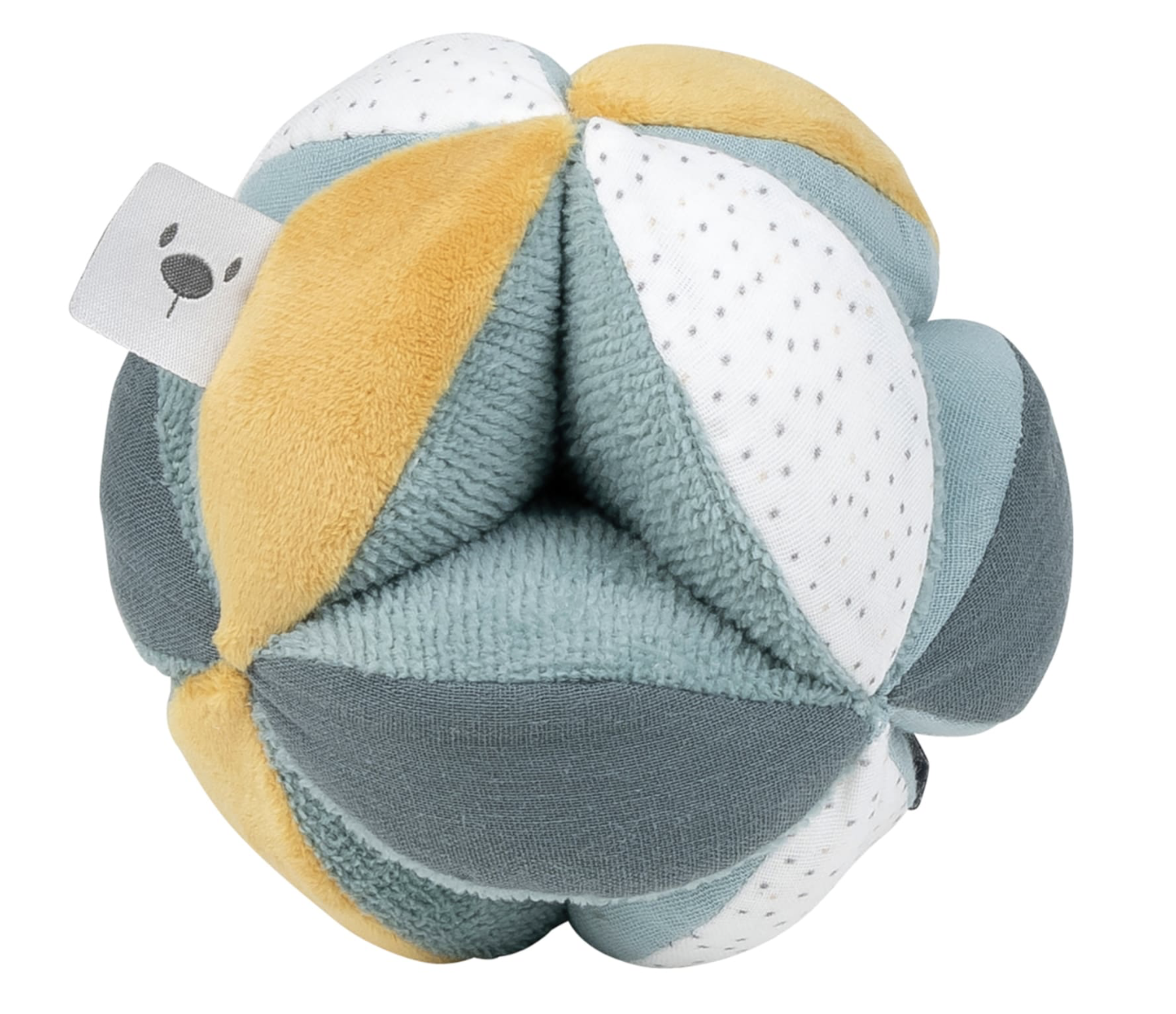 Cosa ha di speciale questa morbida palla? E’ facile da maneggiare, grazie alla sua forma a spicchi, fa un suono delicato (ha all’interno una pallina che ruota e alcune zone sono rivestite di carta scricchiolante).