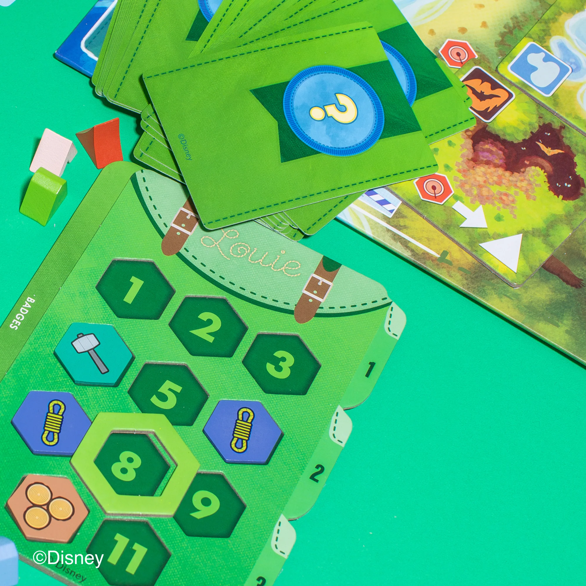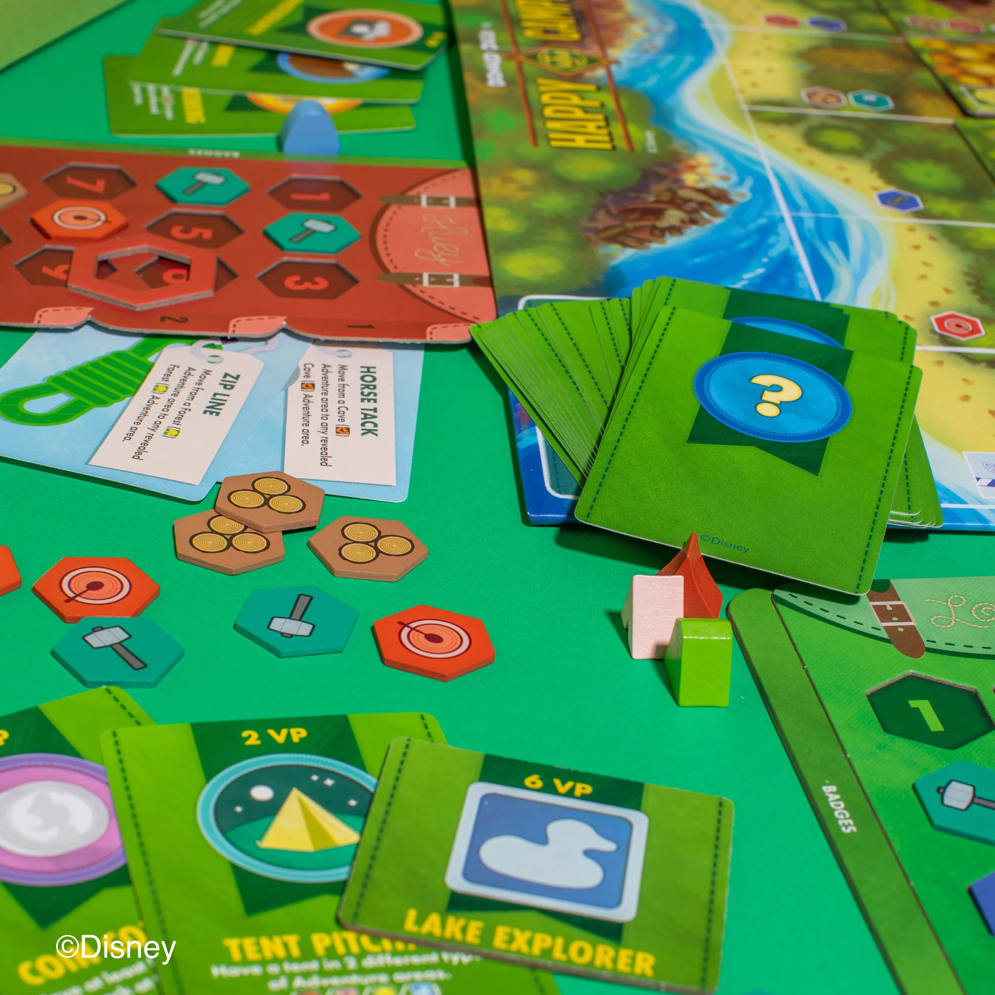 1 Tabellone di gioco, 24 Tessere Area (Foresta, Masso, Caverna, Lago, Prato, Sentiero), 10 Carte Paperino (di cui 1 “Ultimo Giorno!”), 4 Pedine Personaggio: Gaia, Qui, Quo, Qua, 1 Pedina Paperino, 4 Zaini personali, 4 Tracciatori di Movimento, 4 Carte iniziali Gadget “Collezionista”, 4 Carte iniziali Distintivo di Merito “Piantare le Tende”, 24 Carte Distintivo di Merito, 18 Carte Gadget, 4 Tessere Premio Esploratore, 4 Carte di Riferimento Giocatore, 48 Segnalini Risorsa, suddivisi in: 12 Cibo 🍎, 12 Strumenti 🛠️, 12 Legno 🌲, 12 Corde 🧵, 48 Tende (12 per ciascun personaggio).