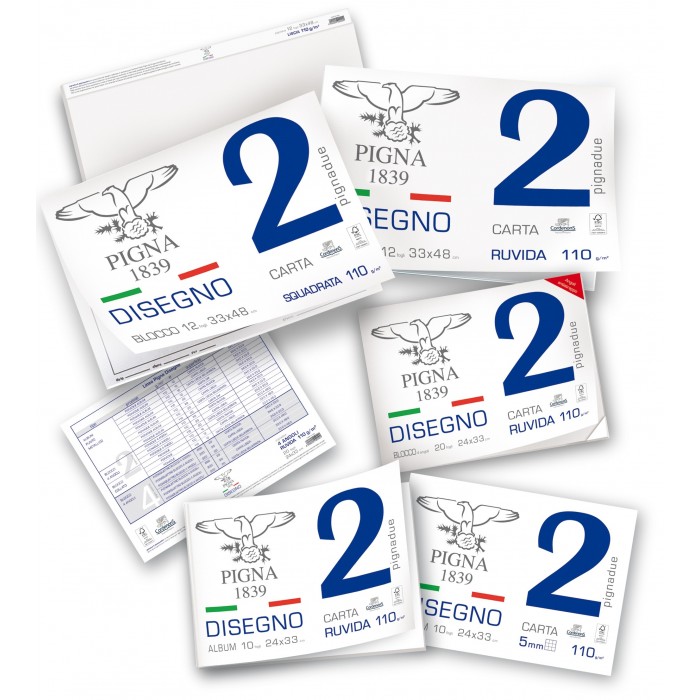 L’album da disegno PIGNA 2 è un prodotto di alta qualità ideale per gli appassionati di disegno, per la scuola o per gli artisti professionisti. Blocco da 10 o 20 fogli 110 g/mq Disponibile in due misure: 24×33 e 33×48 cm Nelle versioni: liscio, ruvido o squadrato